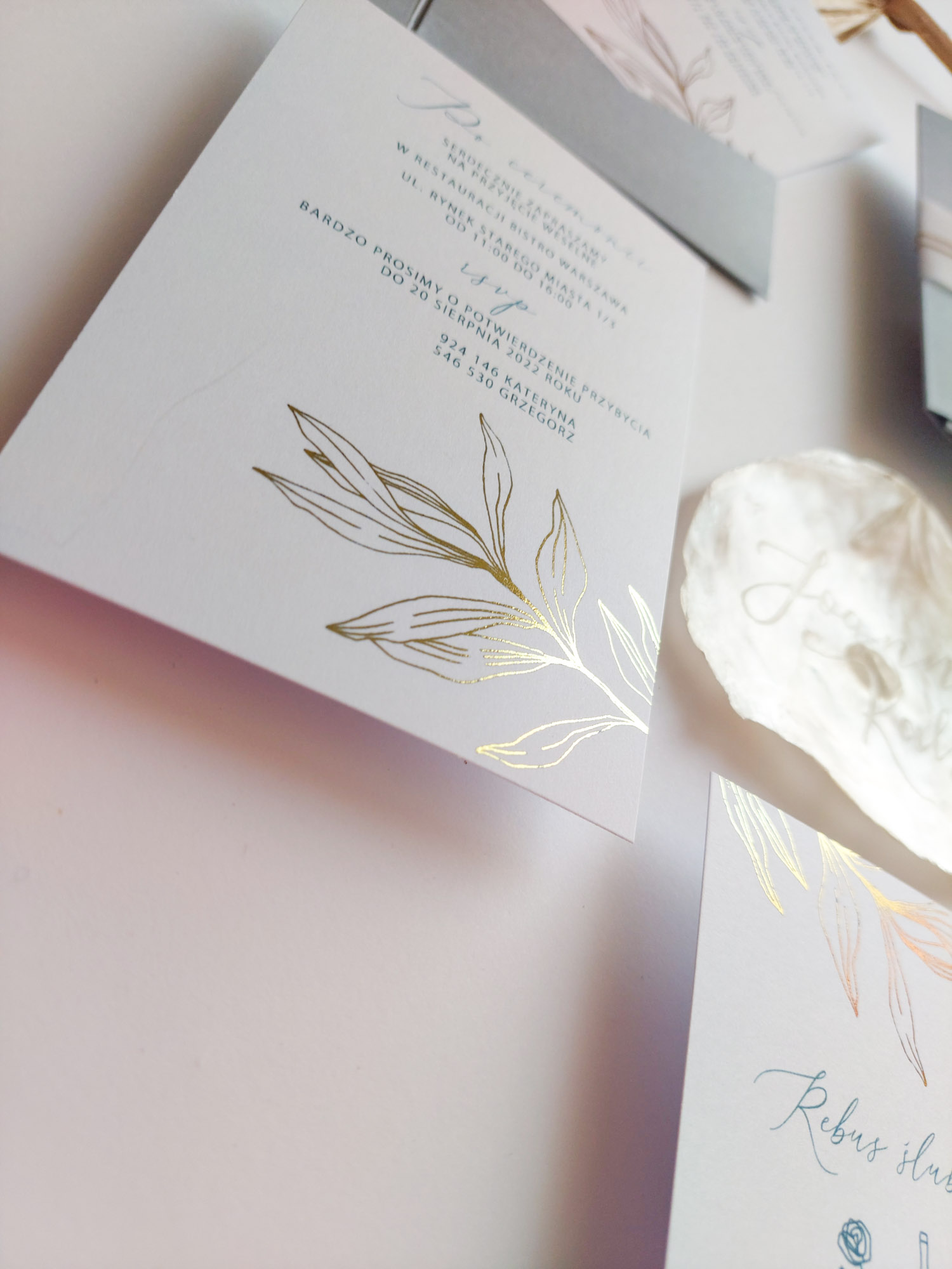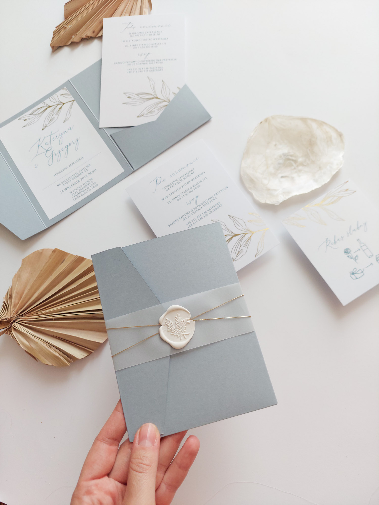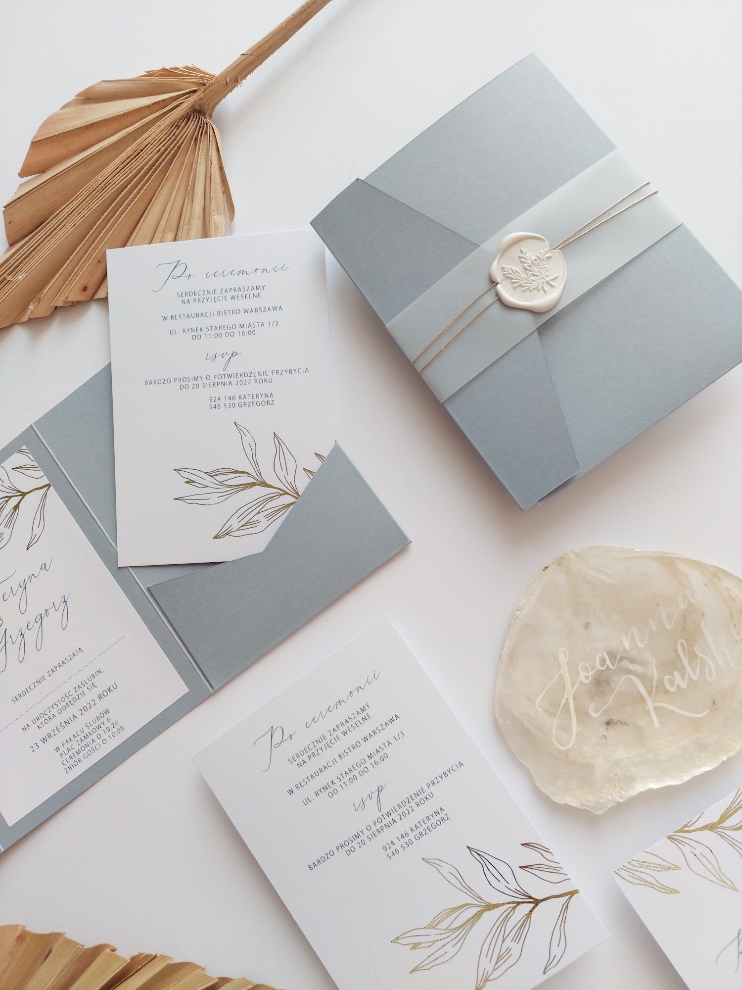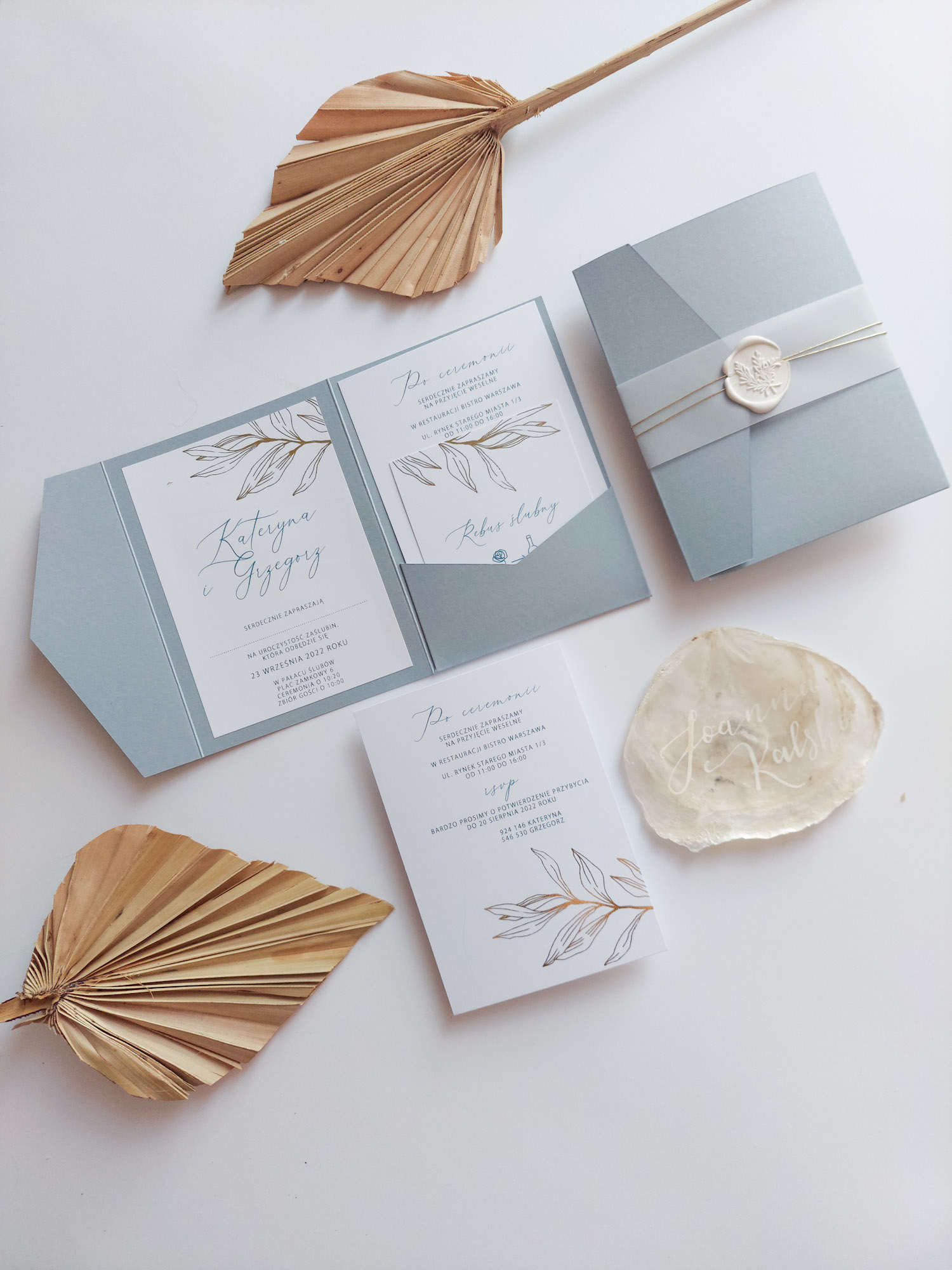 Zaproszenie w formie folderu z kieszonką. Zaproszenie składa się z folderu z kieszonką, trzech kart, opaski, złotego sznurka oraz laku. Karta główna o wymiarach 10×14 cm jest wklejona na stałe do zaproszenia. Pozostałe karty są wsadzone do kieszonki. Karta większa w kieszonce ma rozmiar 10×14 cm, a mniejsza 8x9cm.
