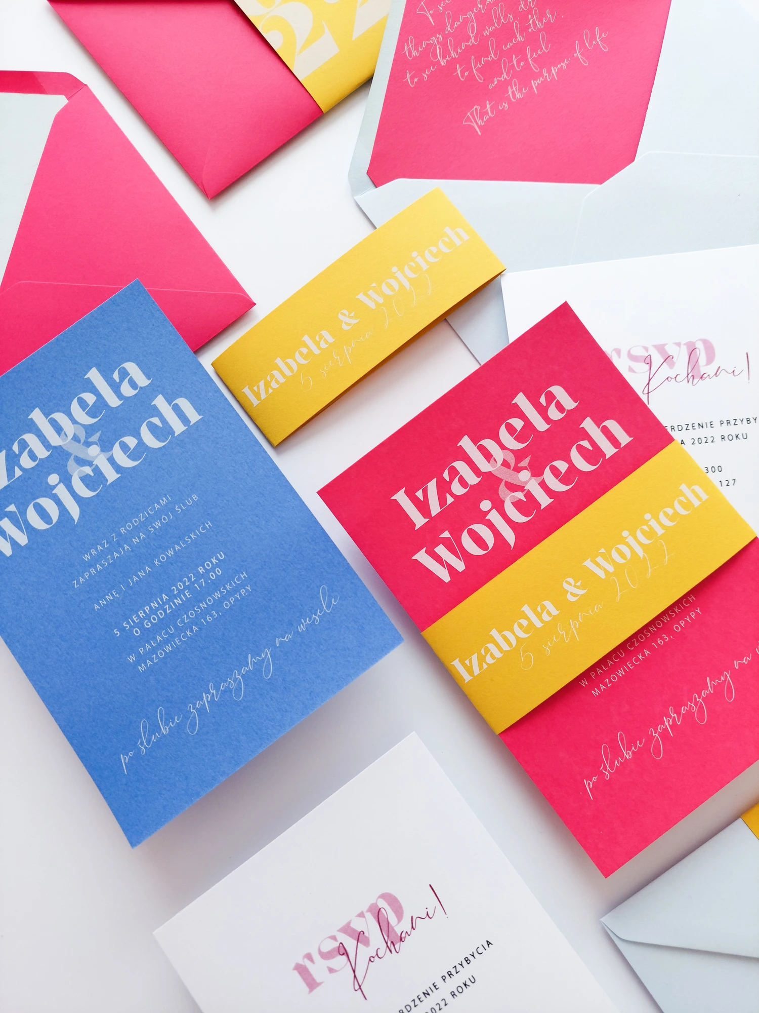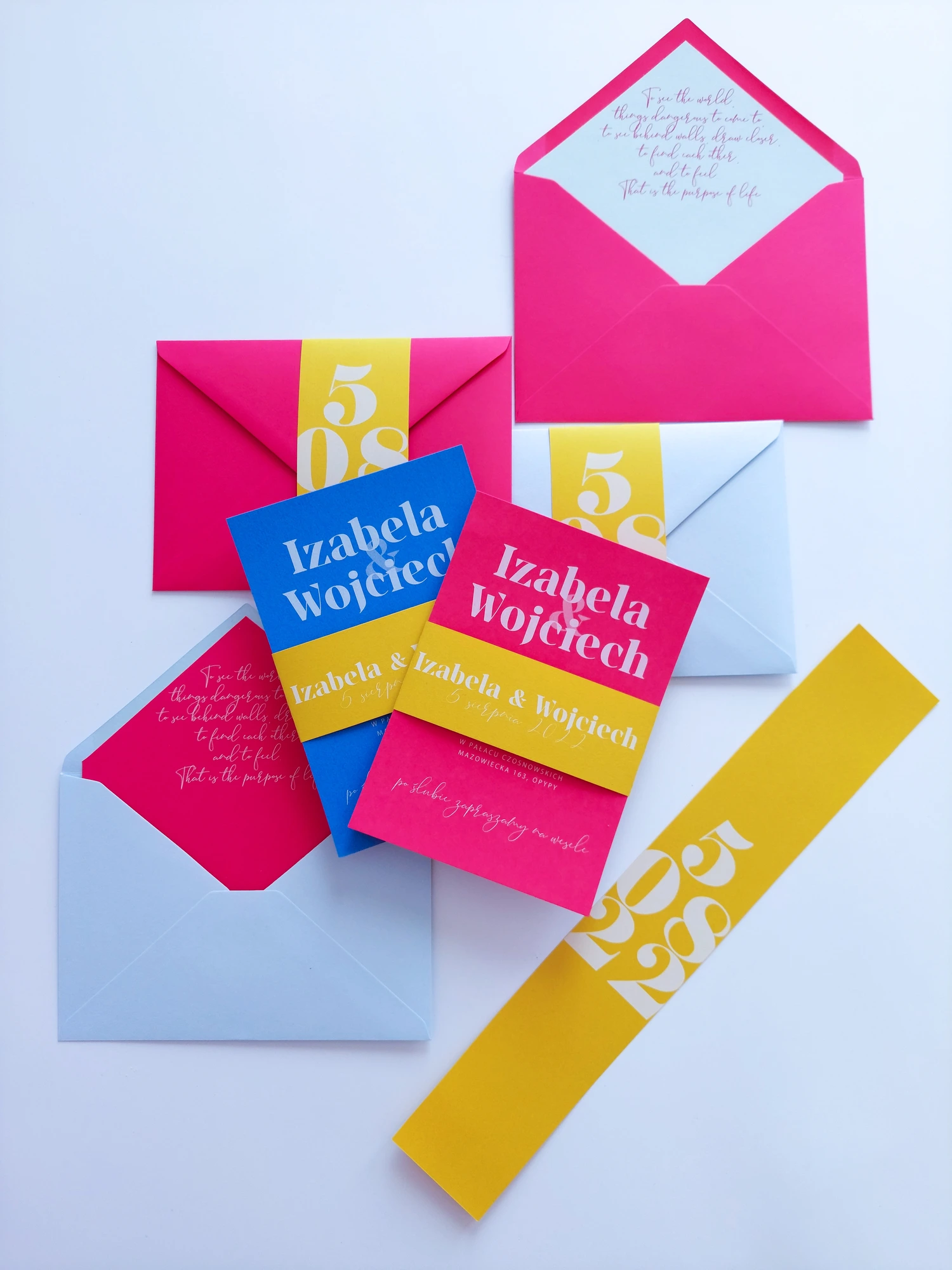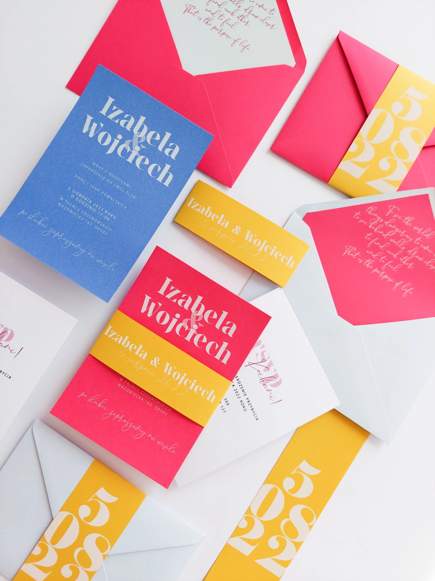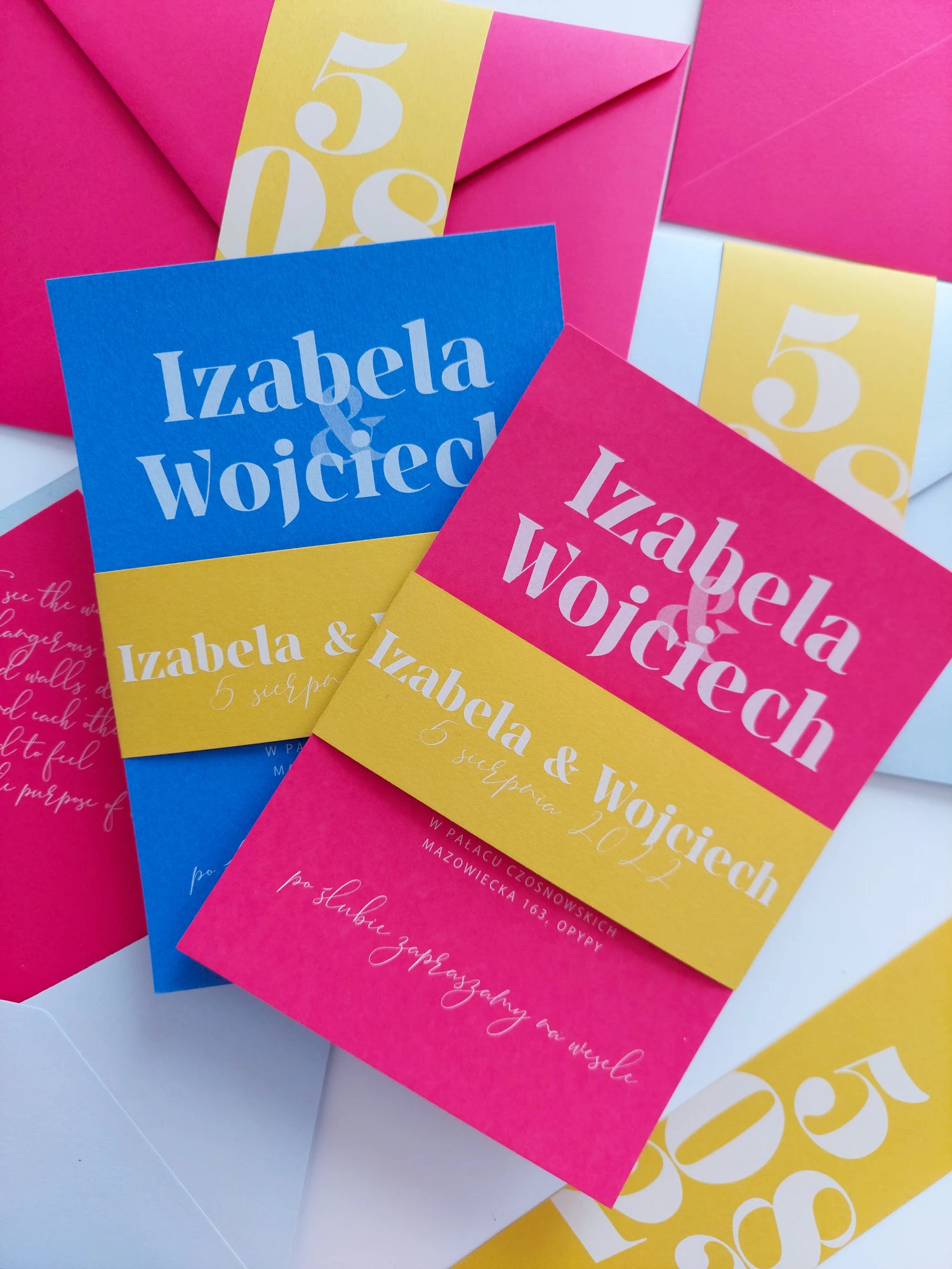 Katy można dowolnie mieszać kolorami. Zaproszenia mogą w całości składać się z określonego koloru lub być jak na zdjęciu, 2 zestawami kolorystycznymi (goście mogą dowolnie trafić na dany kolor, lub możecie zaplanować która cześć gości dostanie wybrany kolor zaproszeń).