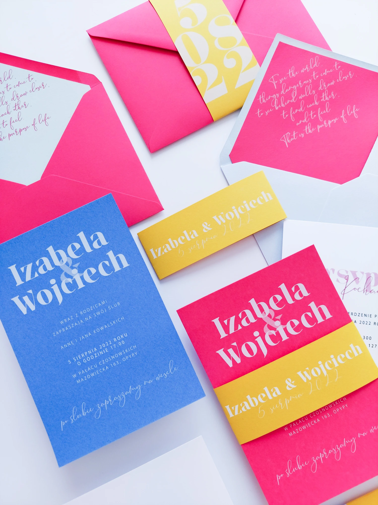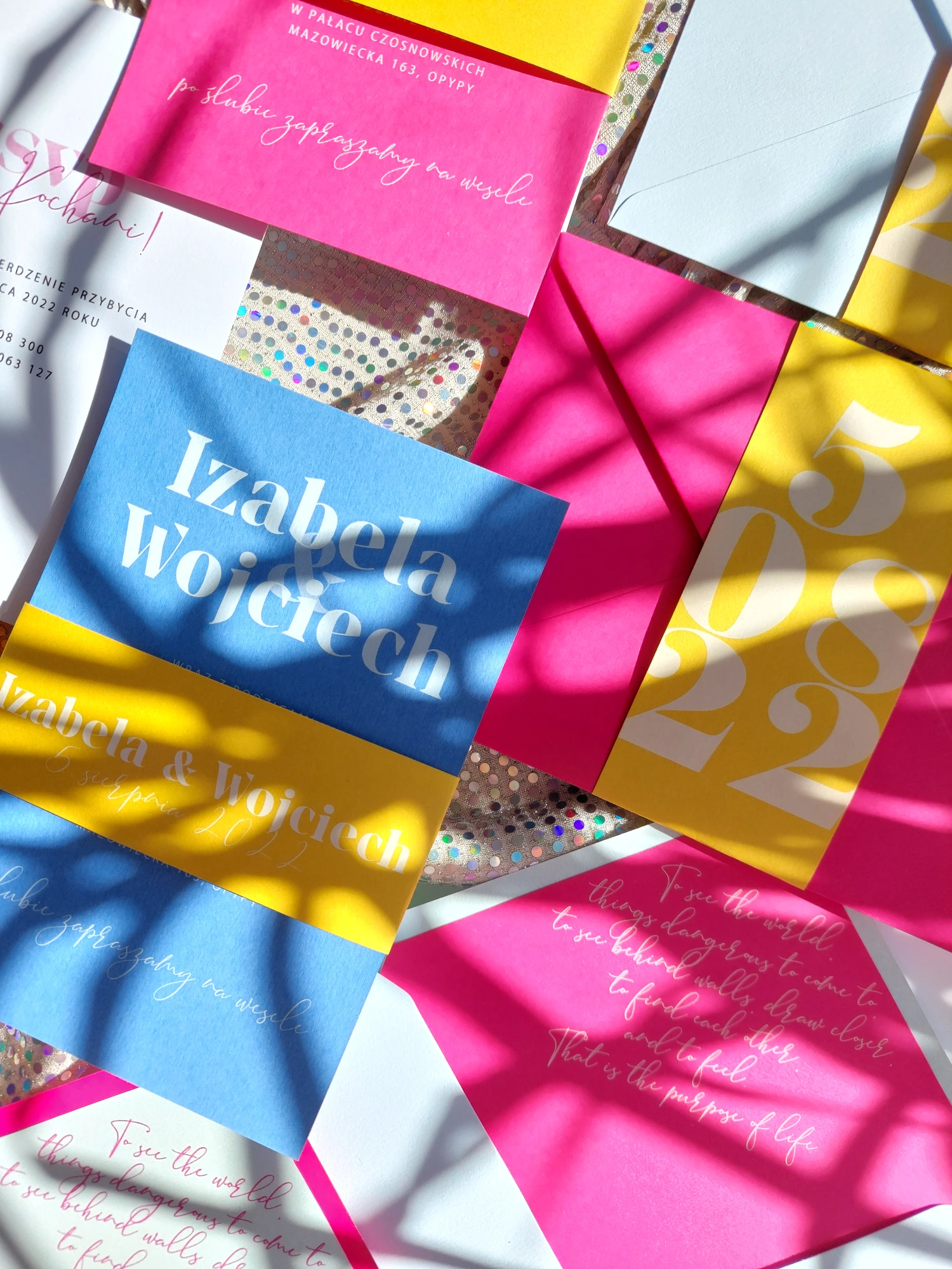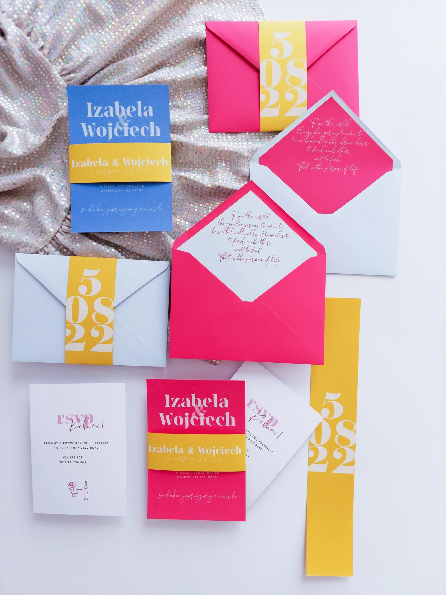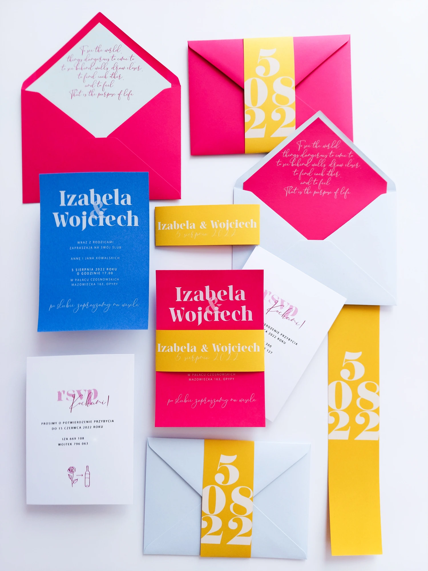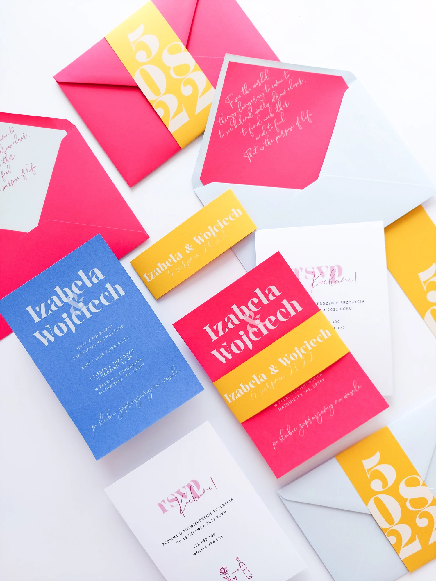Katy można dowolnie mieszać kolorami. Zaproszenia mogą w całości składać się z określonego koloru lub być jak na zdjęciu, 2 zestawami kolorystycznymi (goście mogą dowolnie trafić na dany kolor, lub możecie zaplanować która cześć gości dostanie wybrany kolor zaproszeń).