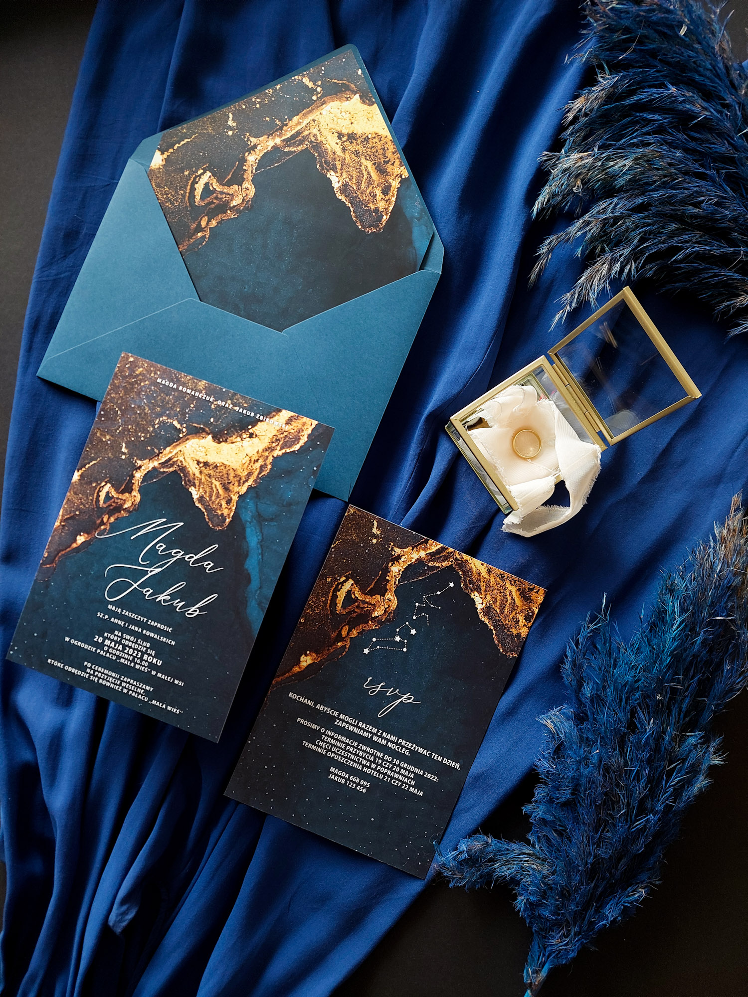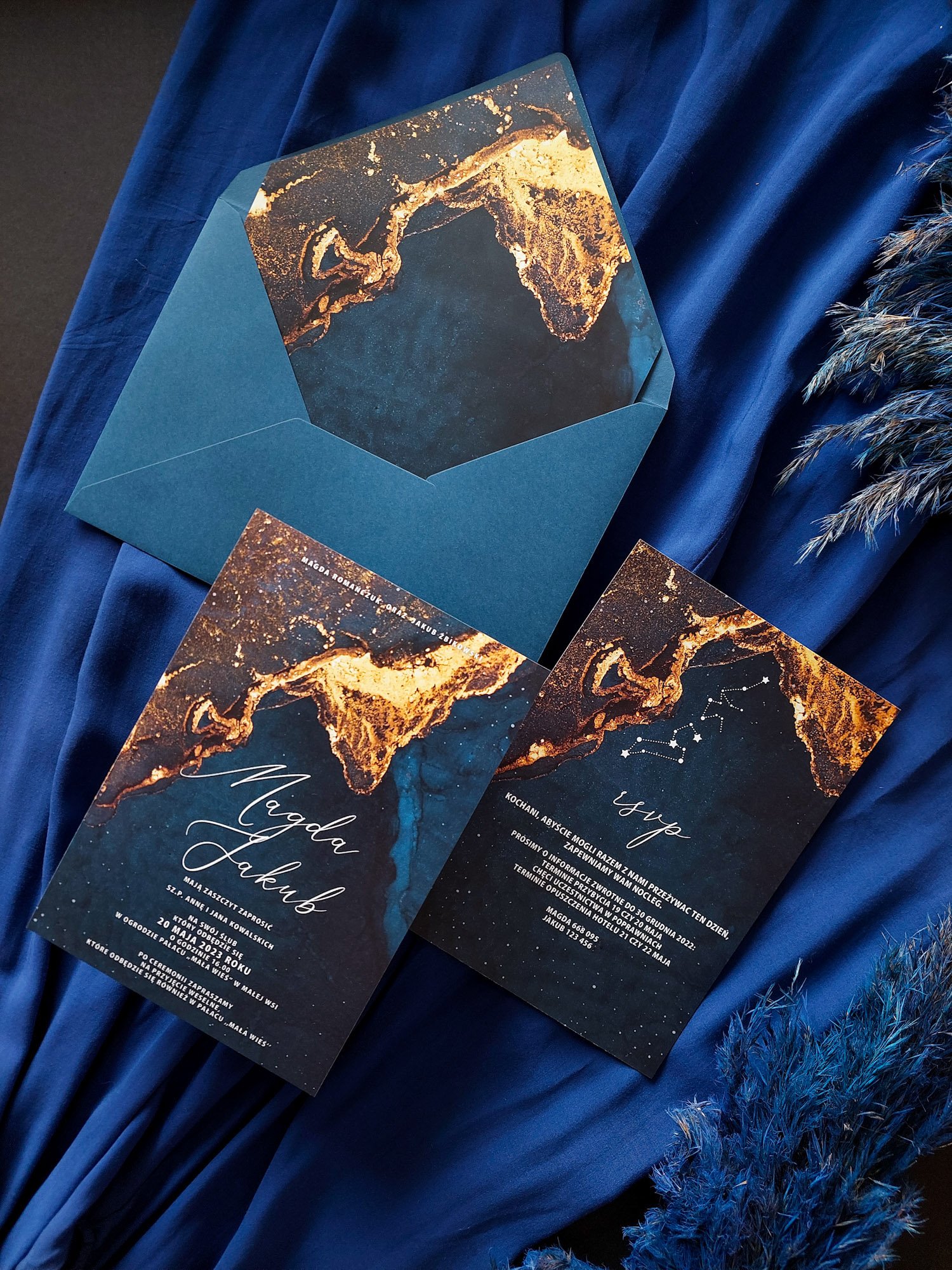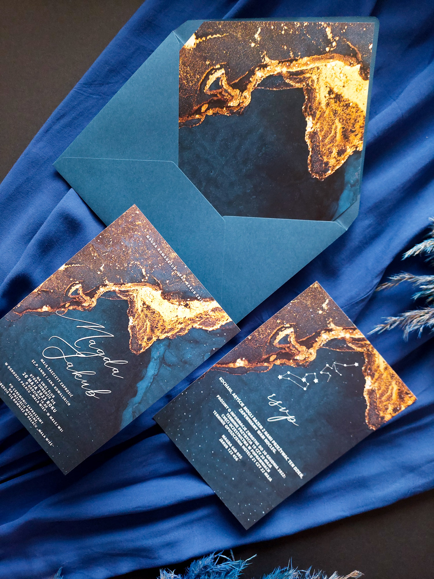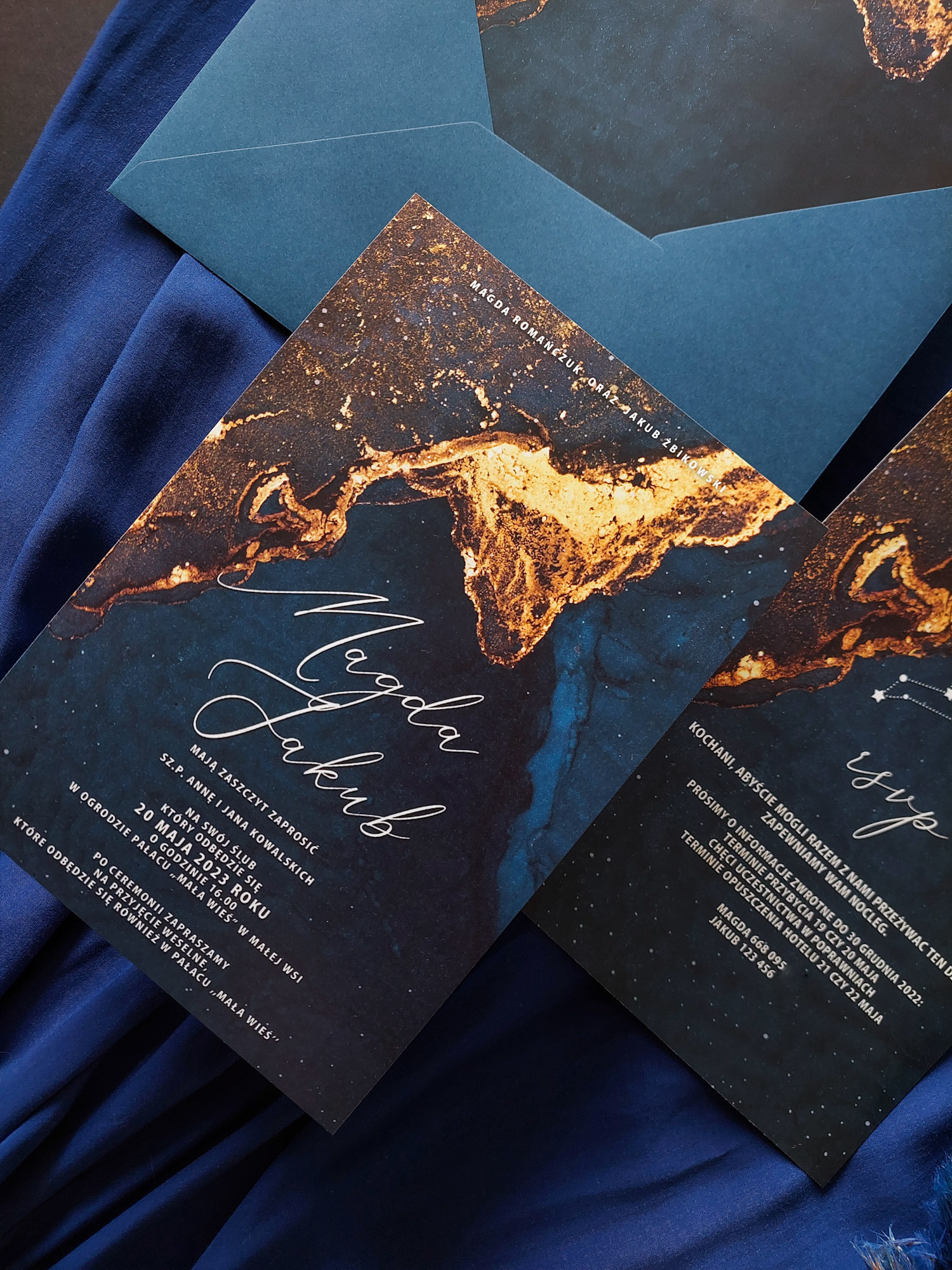Zaproszenie składa się jednej karty wymiarze A5 (jak zeszyt) 14×21 cm. Karta zadrukowana jest dwustronnie na wysokiej jakości papierze o gramaturze 350 gram. Na odwrocie zaproszenia jest informacja o rsvp. Tekst na kartach można dowolnie modyfikować. Zaproszenie posiada przepiękny nadruk w postaci złotej farby alkoholowej rozpuszczonej w granacie. Zaproszenie zamknięte jest w granatowej kopercie z wkładką z motywem zaproszenia.