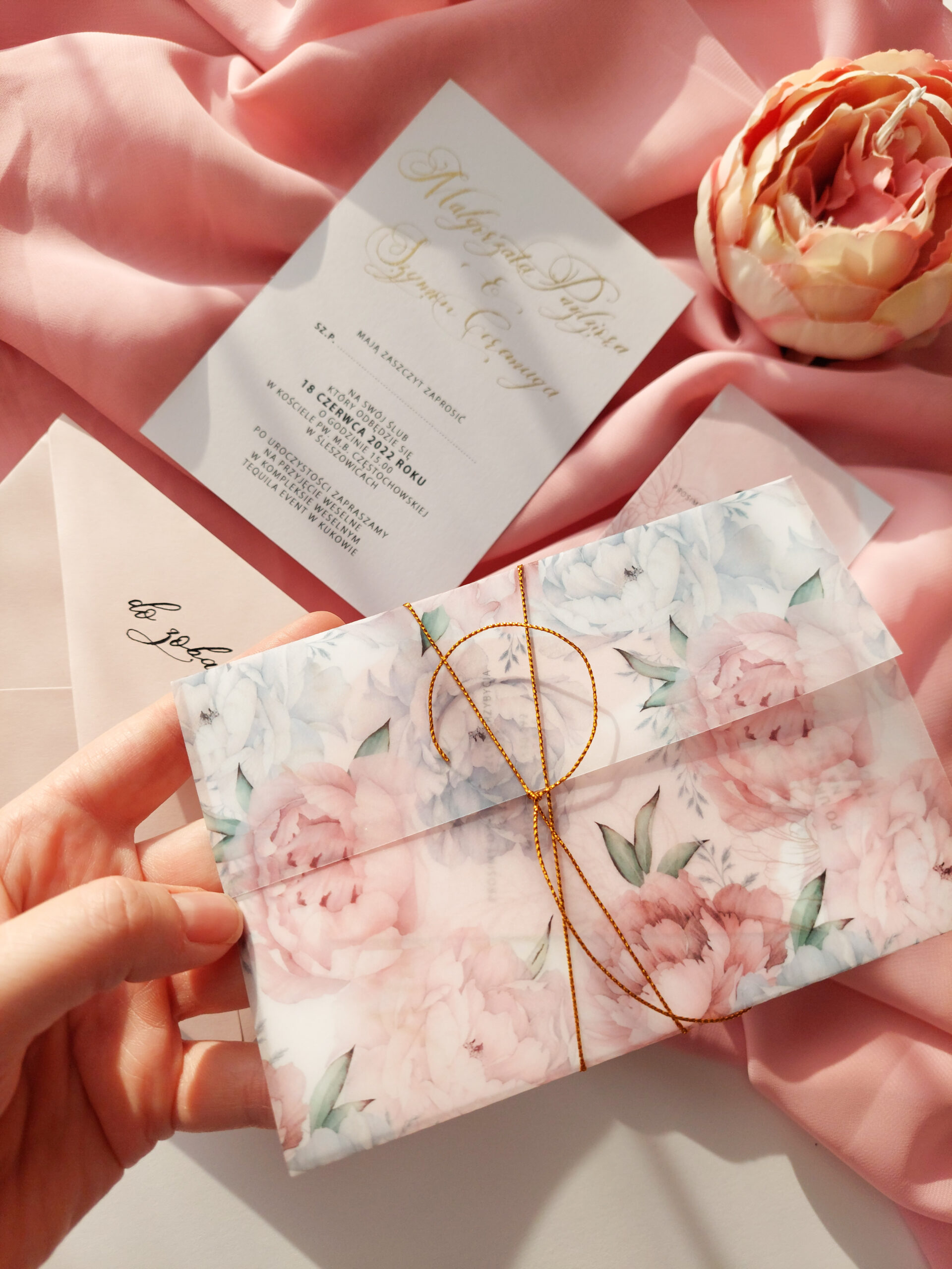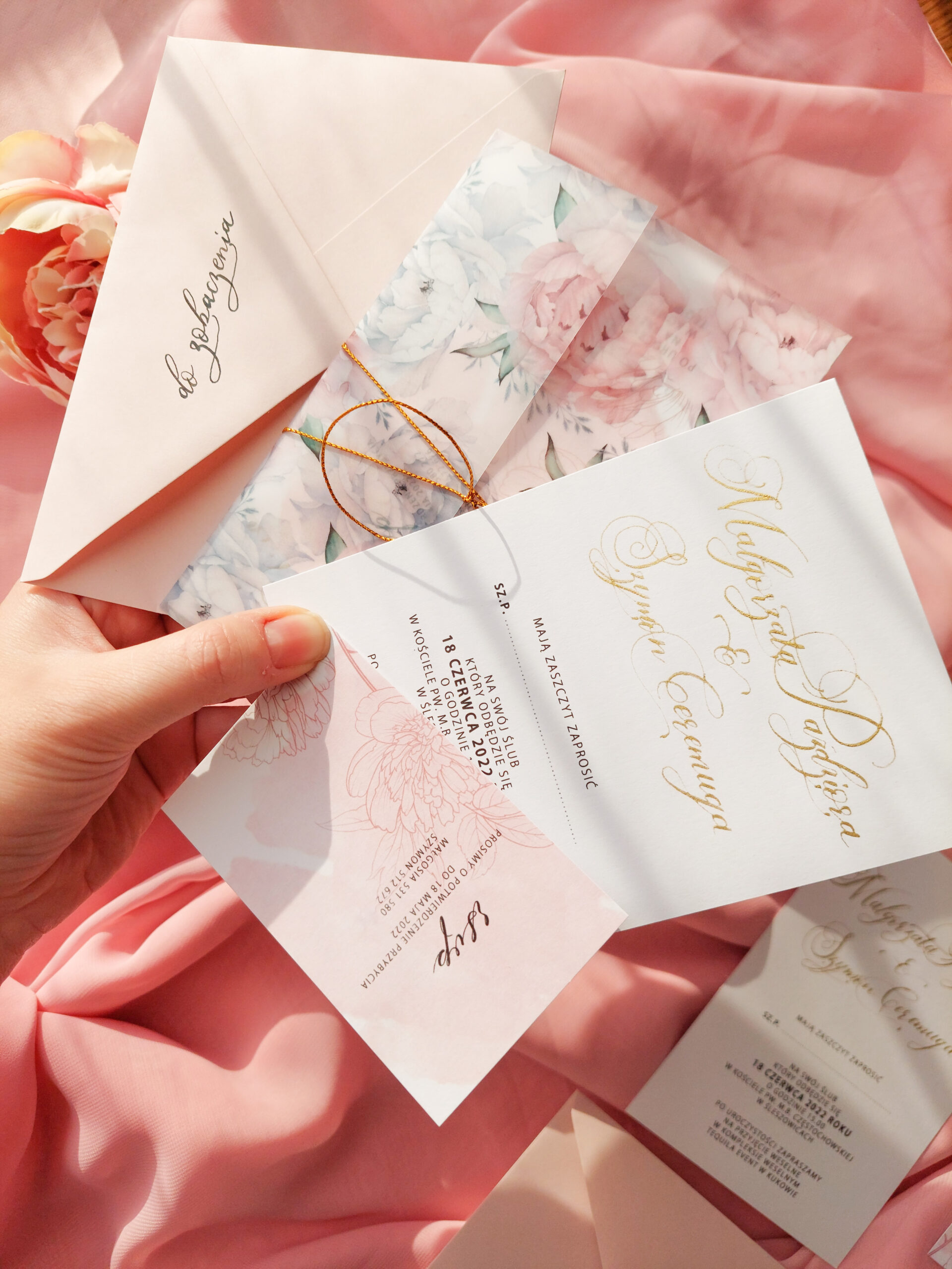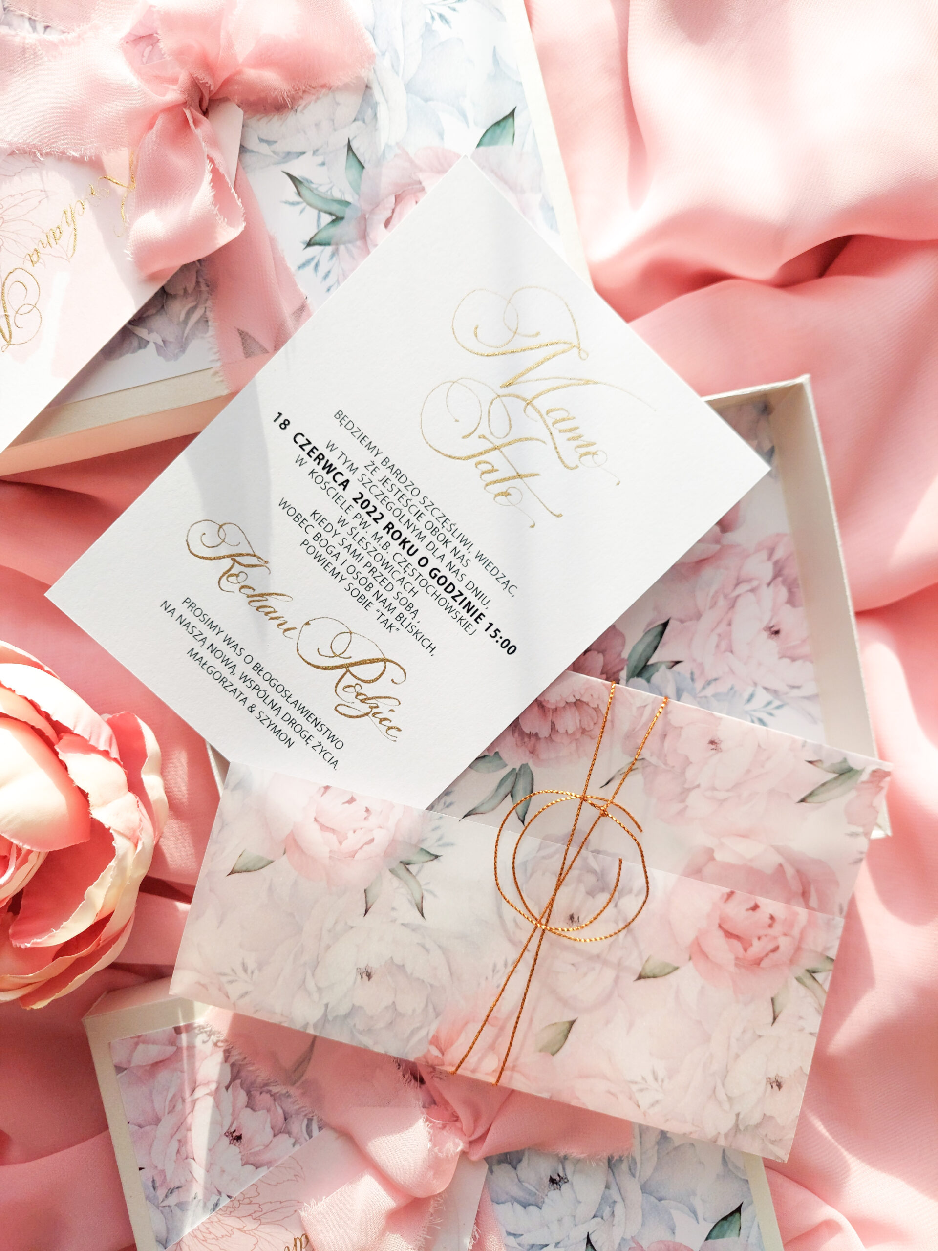 Zaproszenie składa się z dwóch kart. Karty głównej o wymiarach 10×14,5 cm, oraz karty rsvp 9x5cm. Zaproszenia jest wydrukowane jednostronnie na wysokiej jakości papierze o gramaturze 300 gram. Jedna z kart jest zaproszeniem na uroczystość zaślubin oraz wesela, druga natomiast, potwierdzeniem przybycia. Tekst na kartach można dowolnie modyfikować. Karta główna uszlachetniona jest imionami młodych kaligrafowanymi ręcznie złotym tuszem. Karty opasane są obwoluta z kalki z nadrukiem piwonii i przewiązane złotym sznureczkiem. Zaproszenie zamknięte jest w kopercie z dodatkową kaligrafią na klapie zamknięcia.