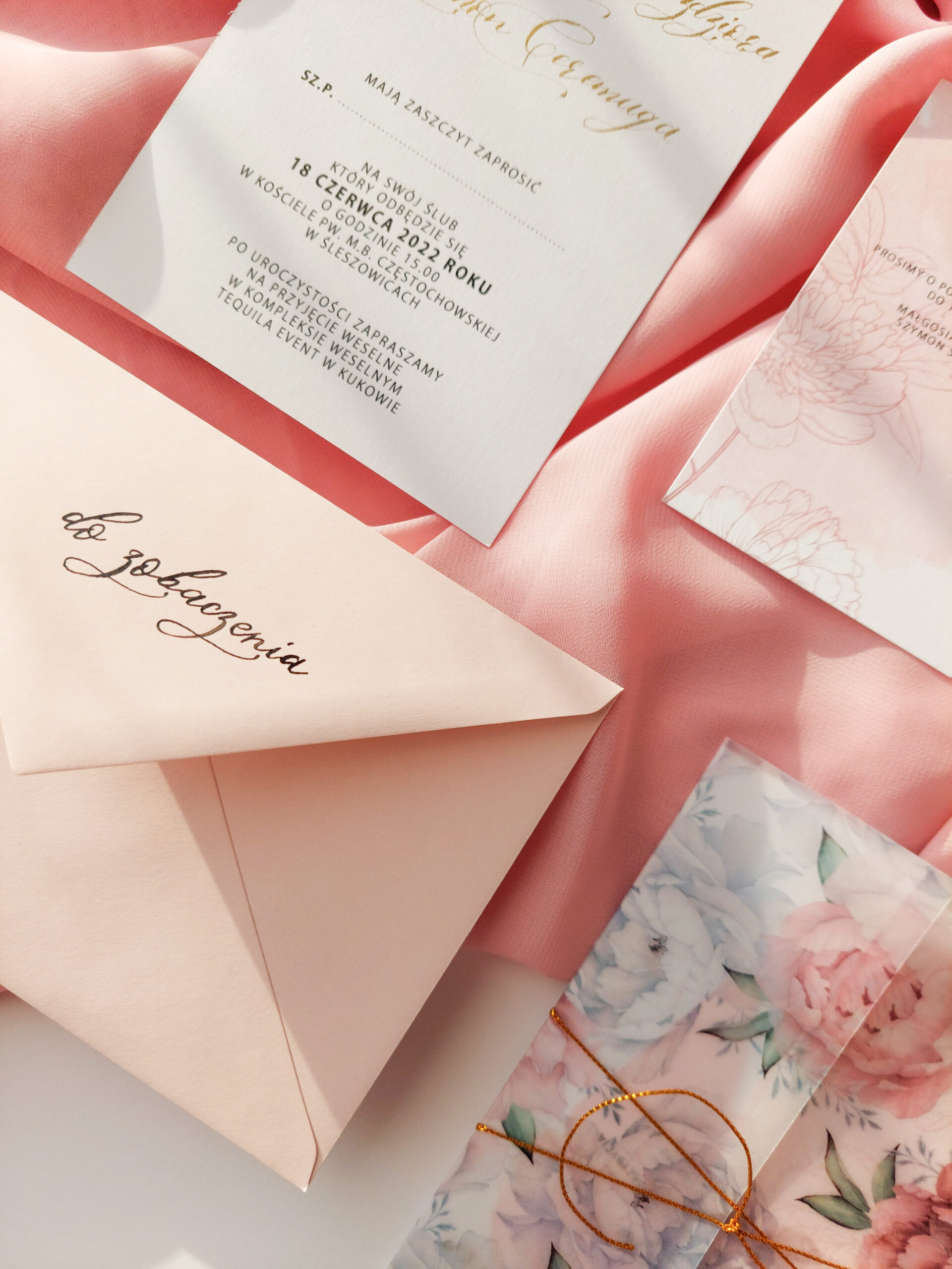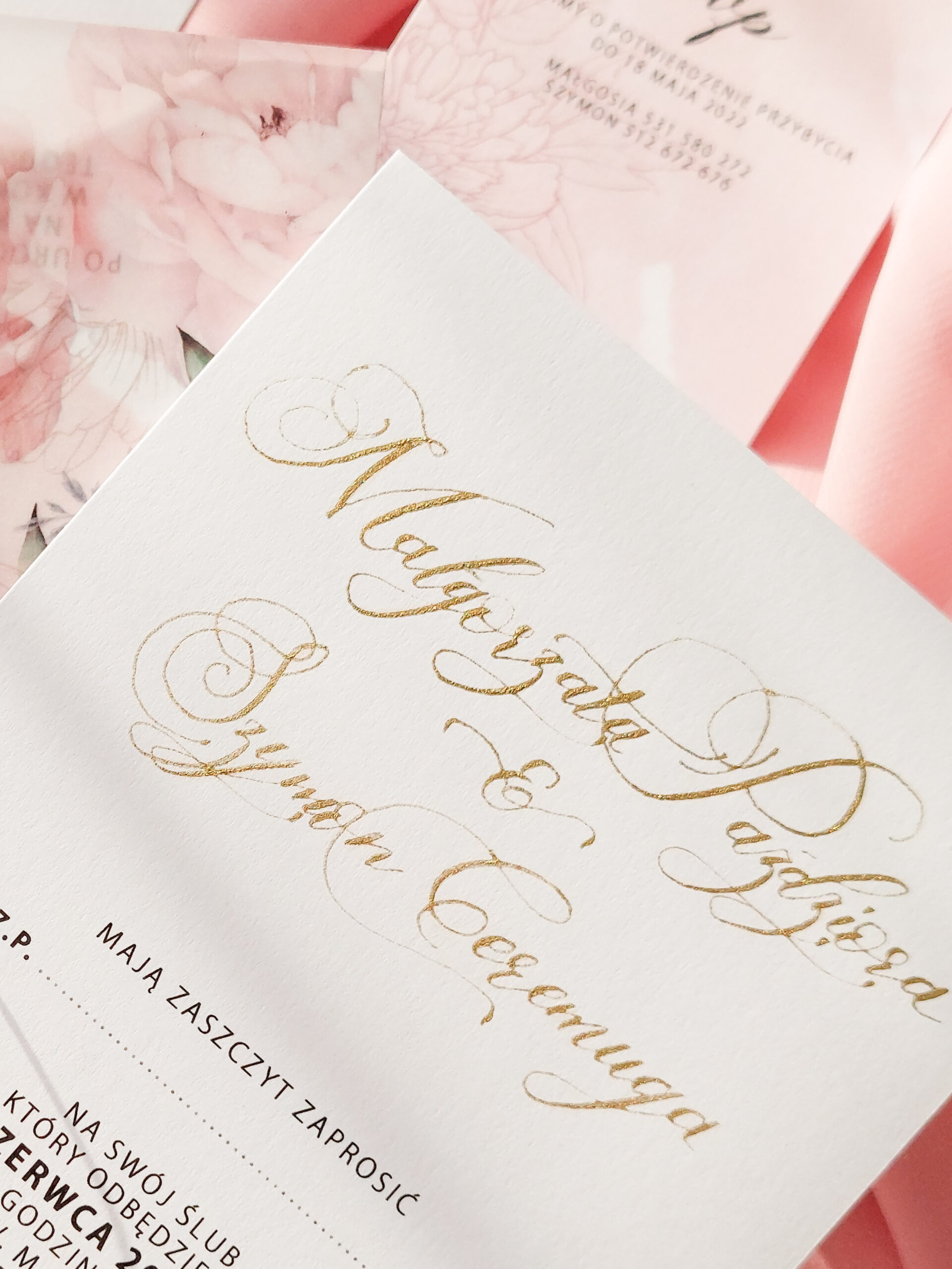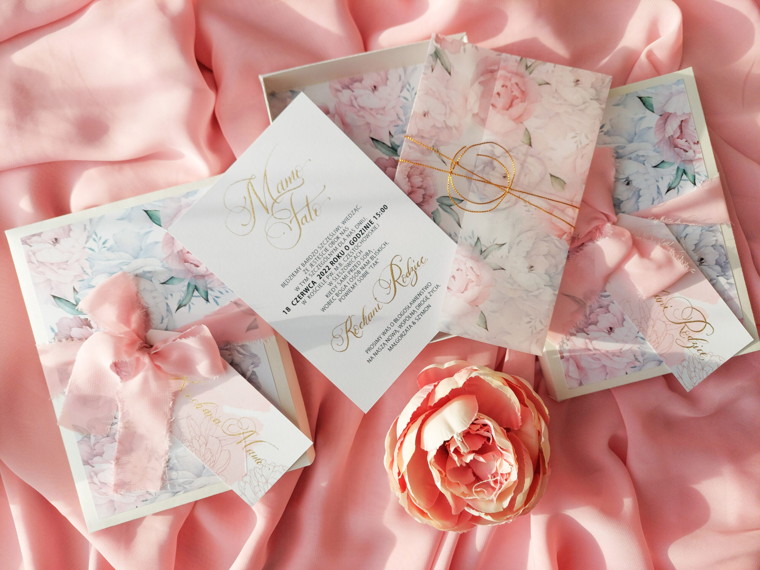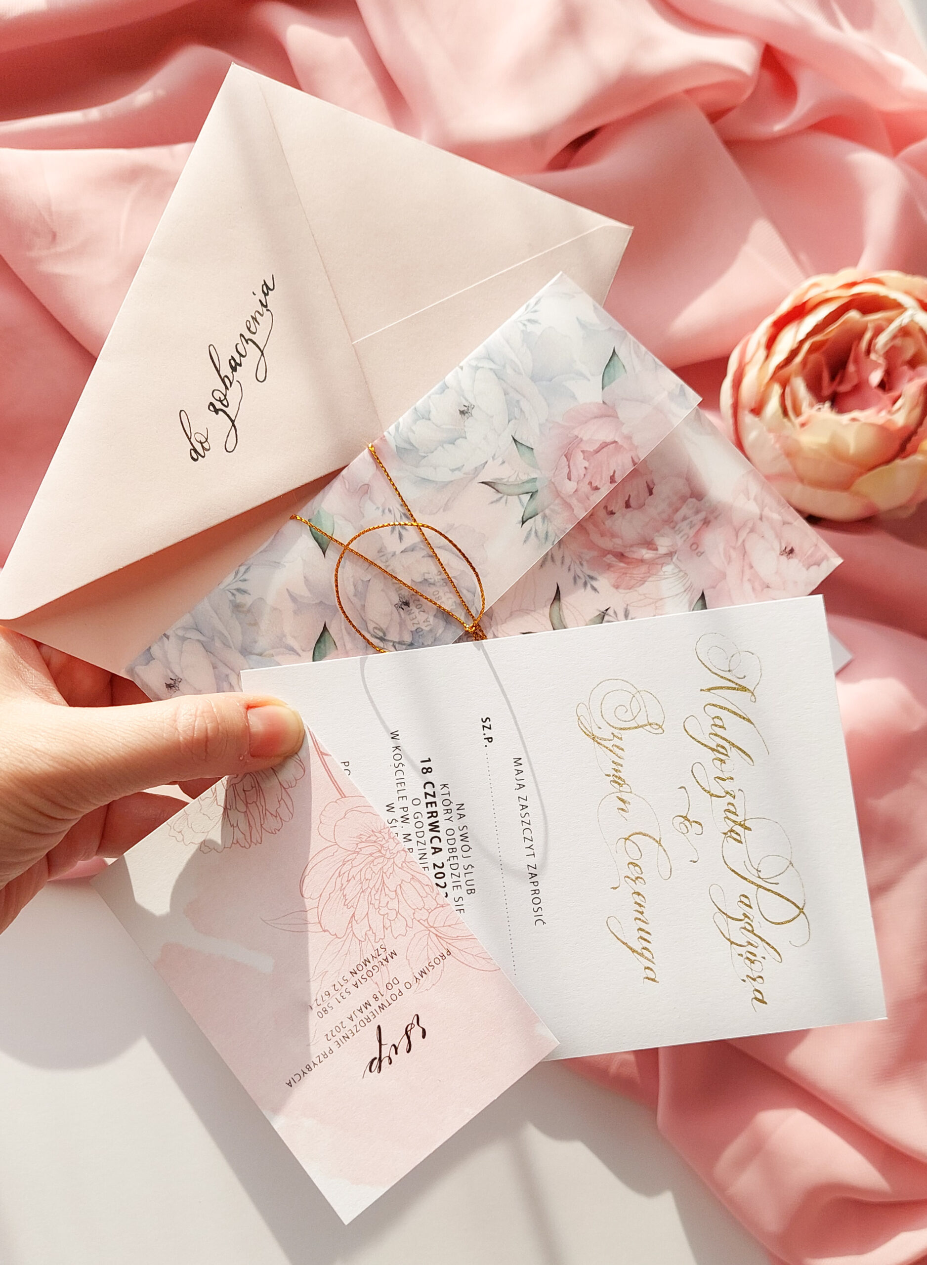 Zaproszenie składa się z dwóch kart. Karty głównej o wymiarach 10×14,5 cm, oraz karty rsvp 9x5cm. Zaproszenia jest wydrukowane jednostronnie na wysokiej jakości papierze o gramaturze 300 gram. Jedna z kart jest zaproszeniem na uroczystość zaślubin oraz wesela, druga natomiast, potwierdzeniem przybycia. Tekst na kartach można dowolnie modyfikować. Karta główna uszlachetniona jest imionami młodych kaligrafowanymi ręcznie złotym tuszem. Karty opasane są obwoluta z kalki z nadrukiem piwonii i przewiązane złotym sznureczkiem. Zaproszenie zamknięte jest w kopercie z dodatkową kaligrafią na klapie zamknięcia.