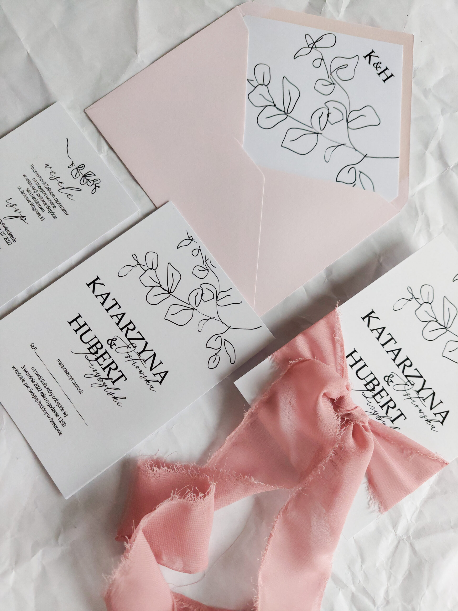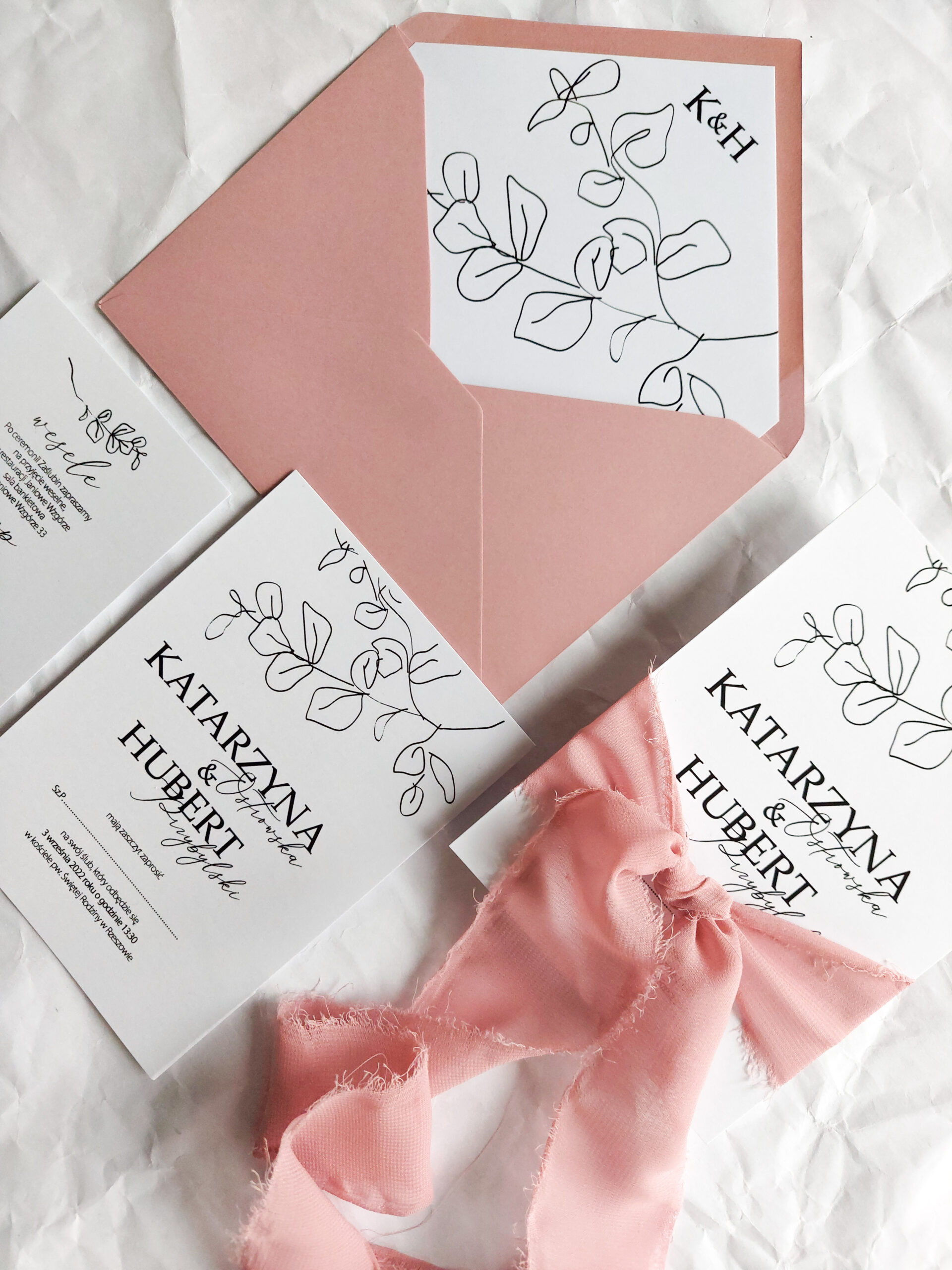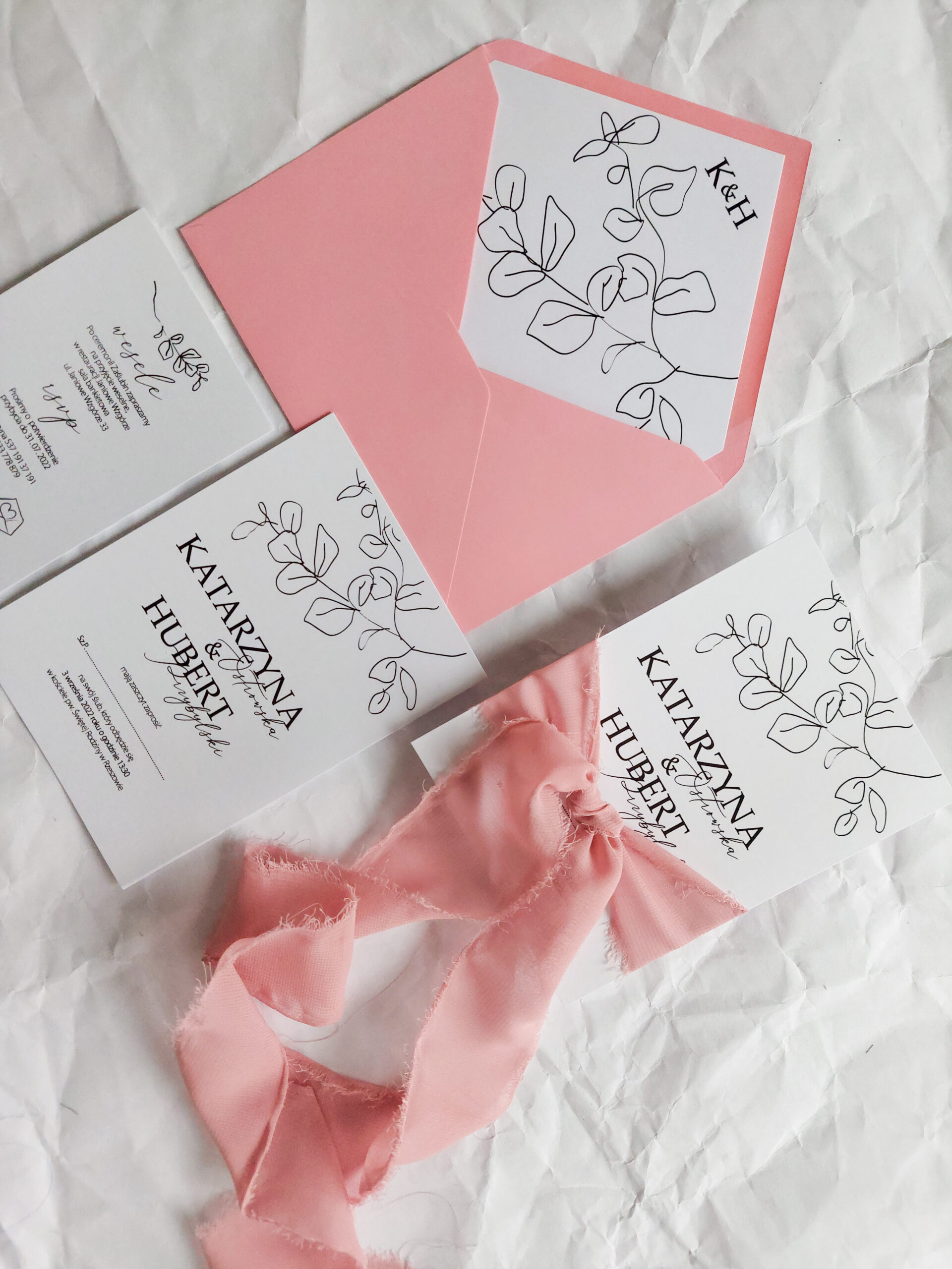 Zaproszenie składa się z dwóch kart. Karty głównej o wymiarach 10×14,5 cm, oraz karty dodatkowej (informacje o weselu + rsvp) w rozmiarze 8x12cm. Karty wydrukowane są jednostronnie na wysokiej jakości papierze o gramaturze 350 gram. Tekst na kartach można dowolnie modyfikować. Karty zaproszenia opasane są ręcznie rwaną wstążką szyfonową.. Zaproszenie zamknięte jest w kopercie kolorowej z dodatkową wkładką z nadrukiem liści i inicjałów młodych