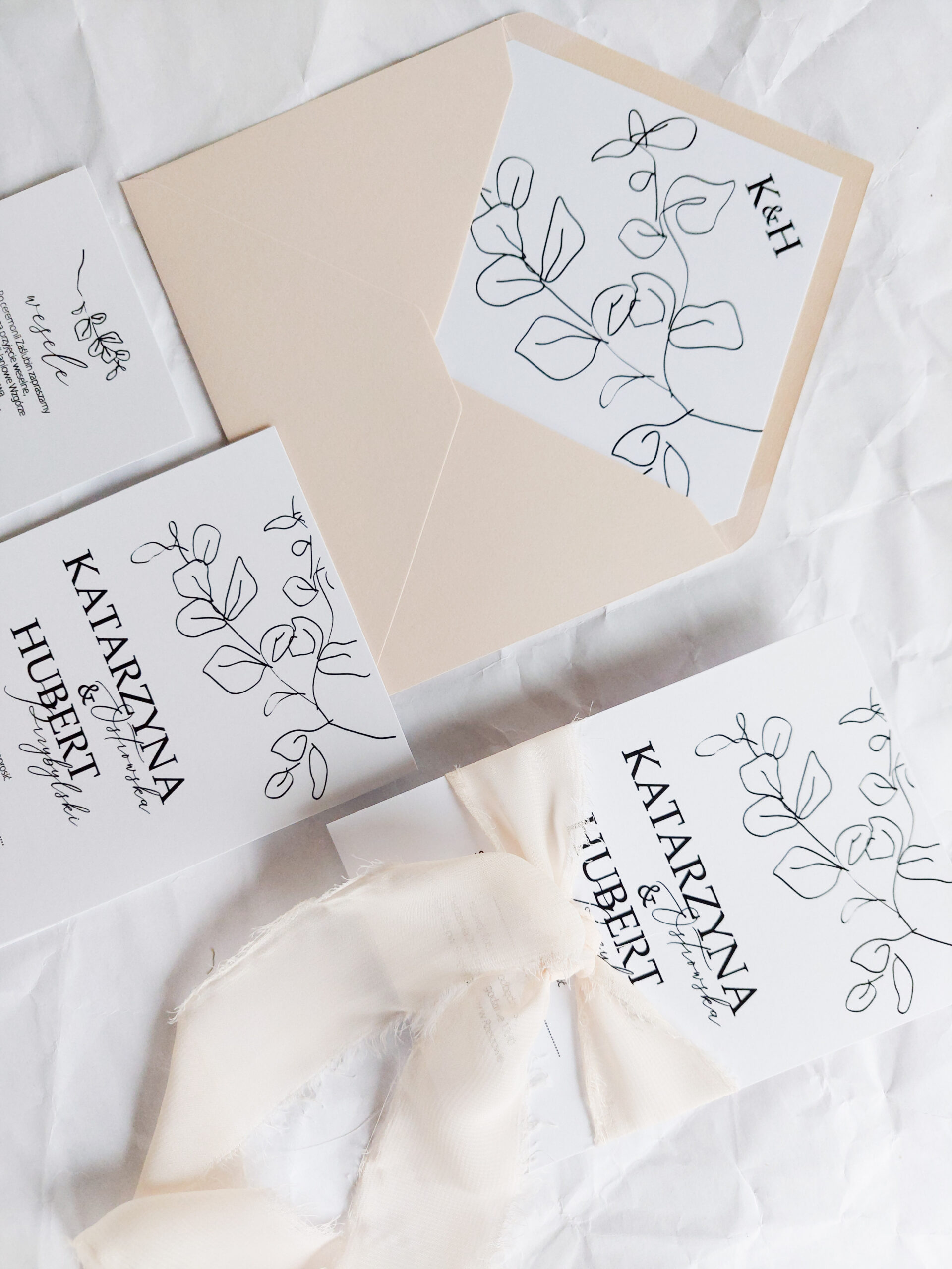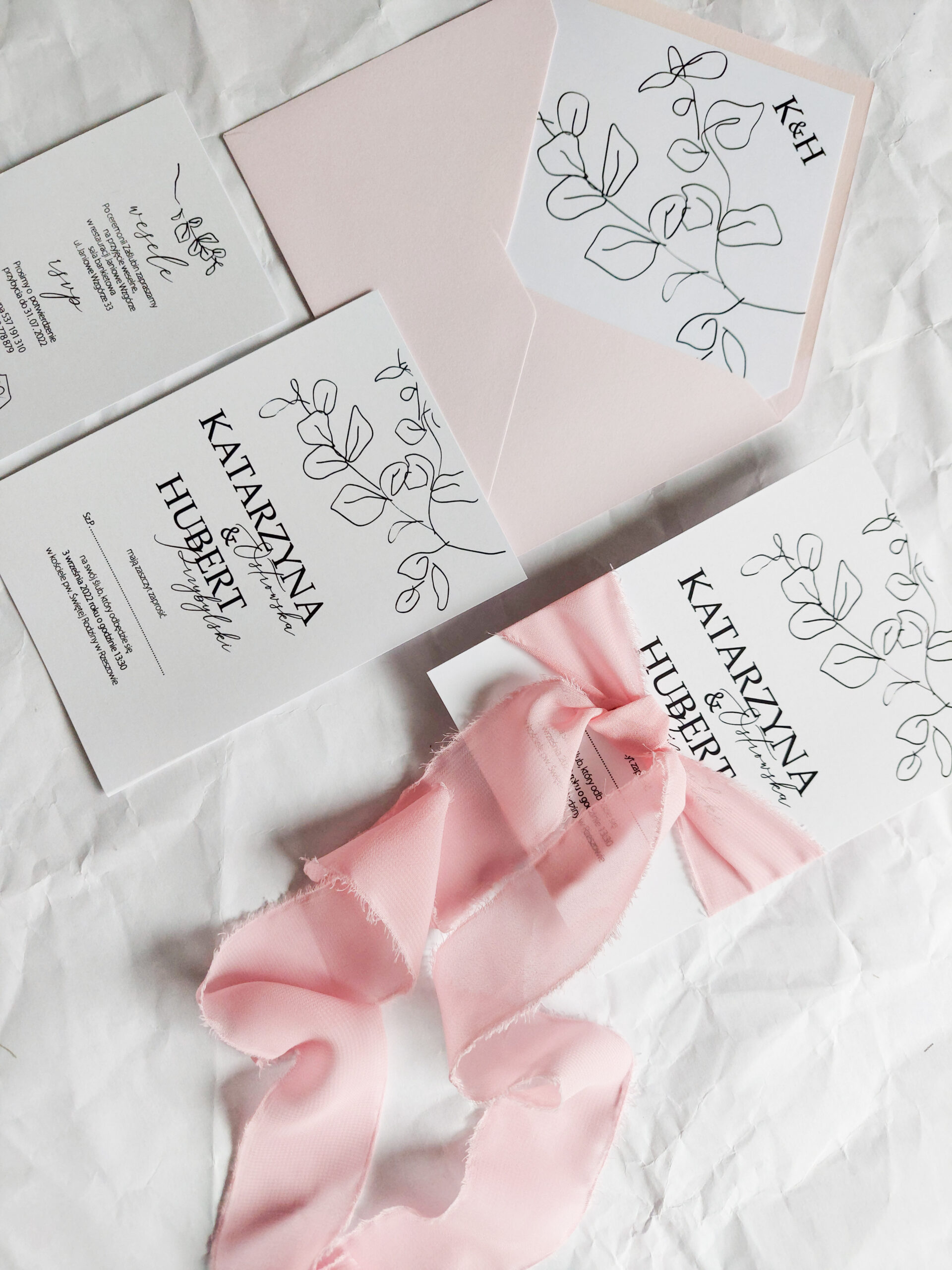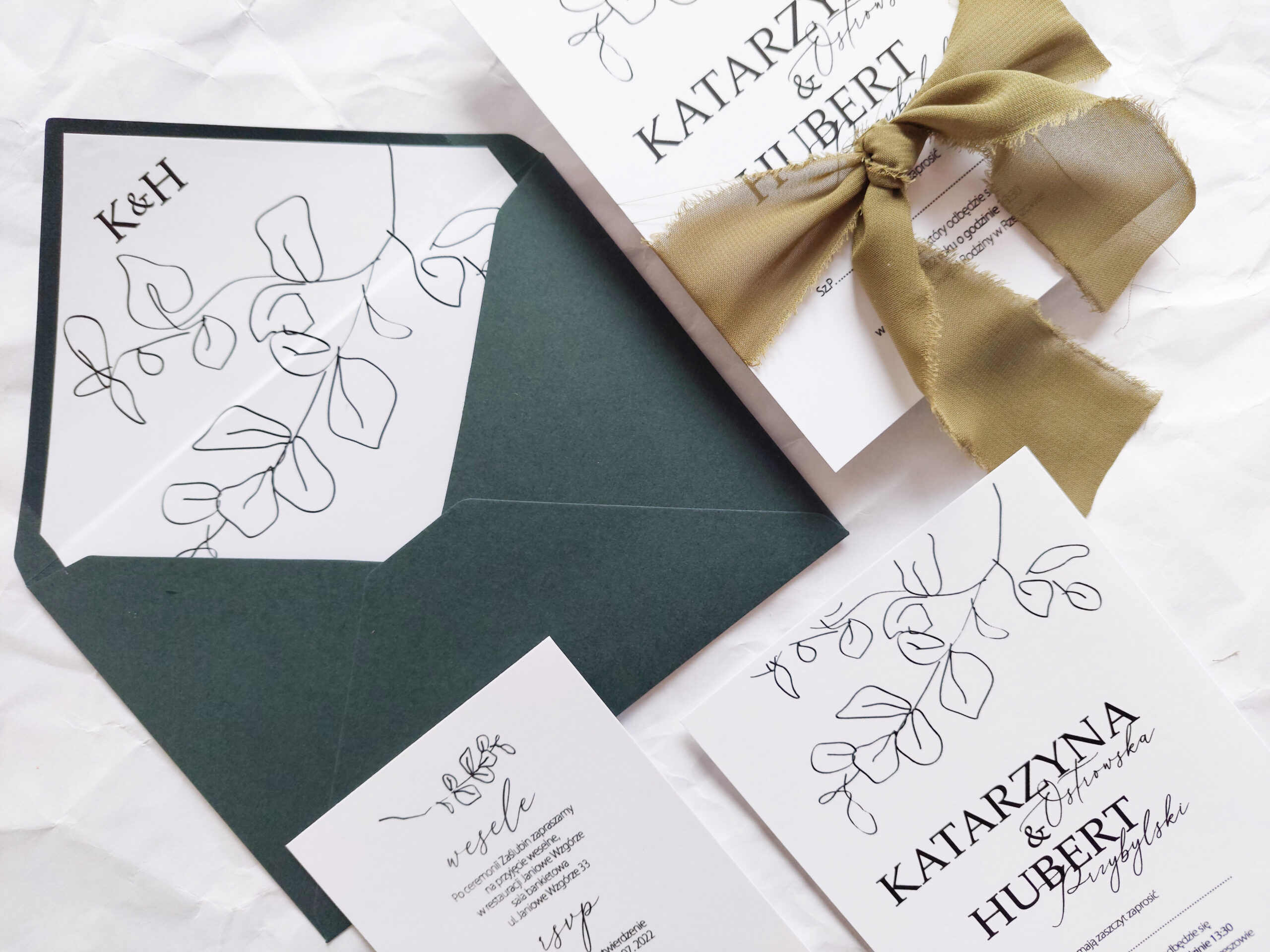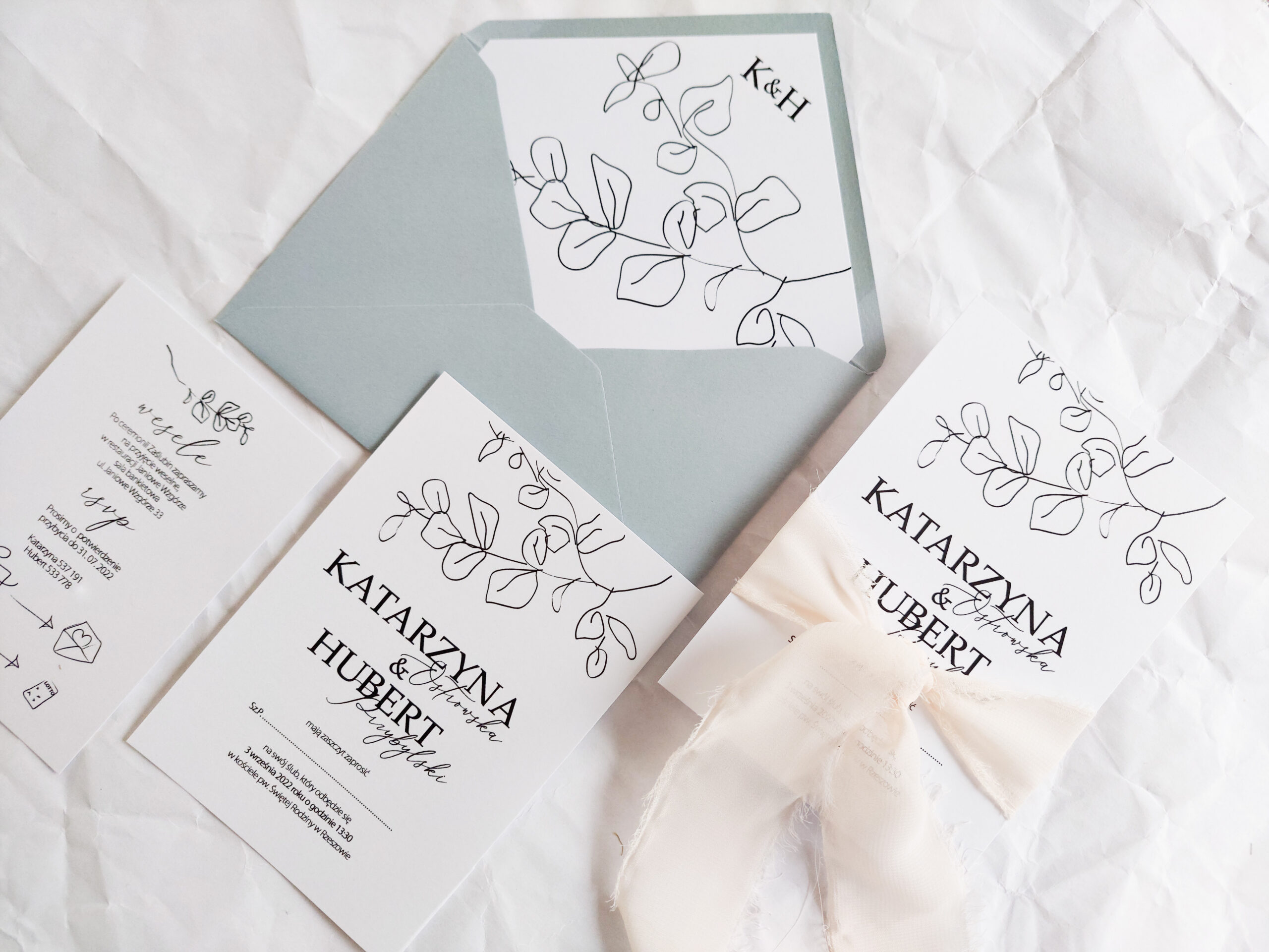 Zaproszenie składa się z dwóch kart. Karty głównej o wymiarach 10×14,5 cm, oraz karty dodatkowej (informacje o weselu + rsvp) w rozmiarze 8x12cm. Karty wydrukowane są jednostronnie na wysokiej jakości papierze o gramaturze 350 gram. Tekst na kartach można dowolnie modyfikować. Karty zaproszenia opasane są ręcznie rwaną wstążką szyfonową.. Zaproszenie zamknięte jest w kopercie kolorowej z dodatkową wkładką z nadrukiem liści i inicjałów młodych