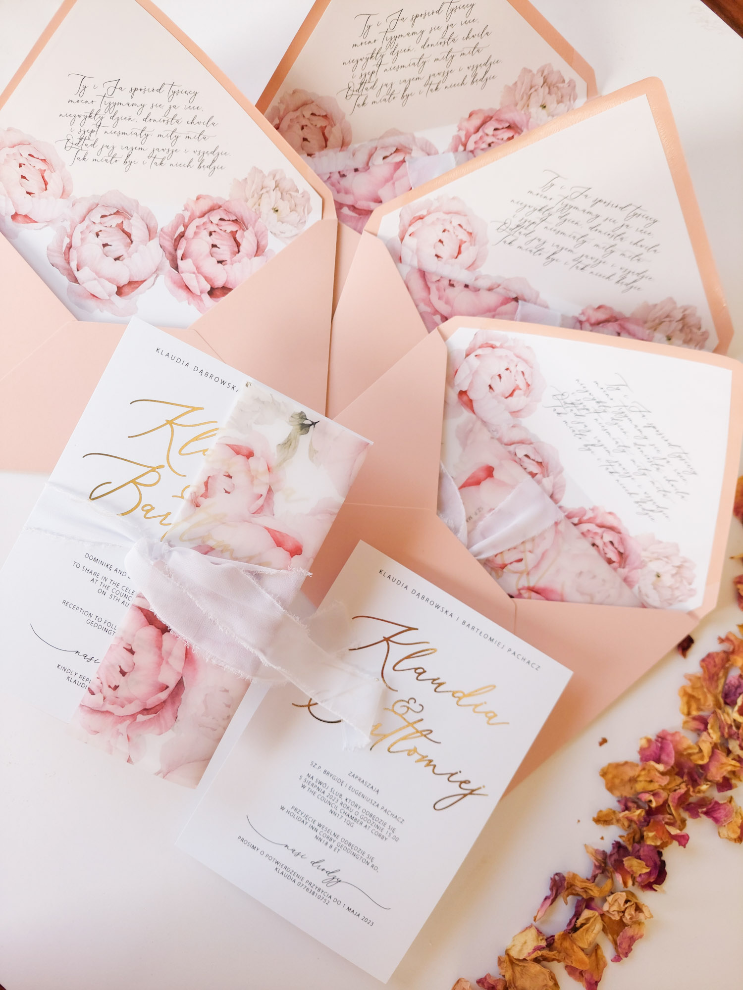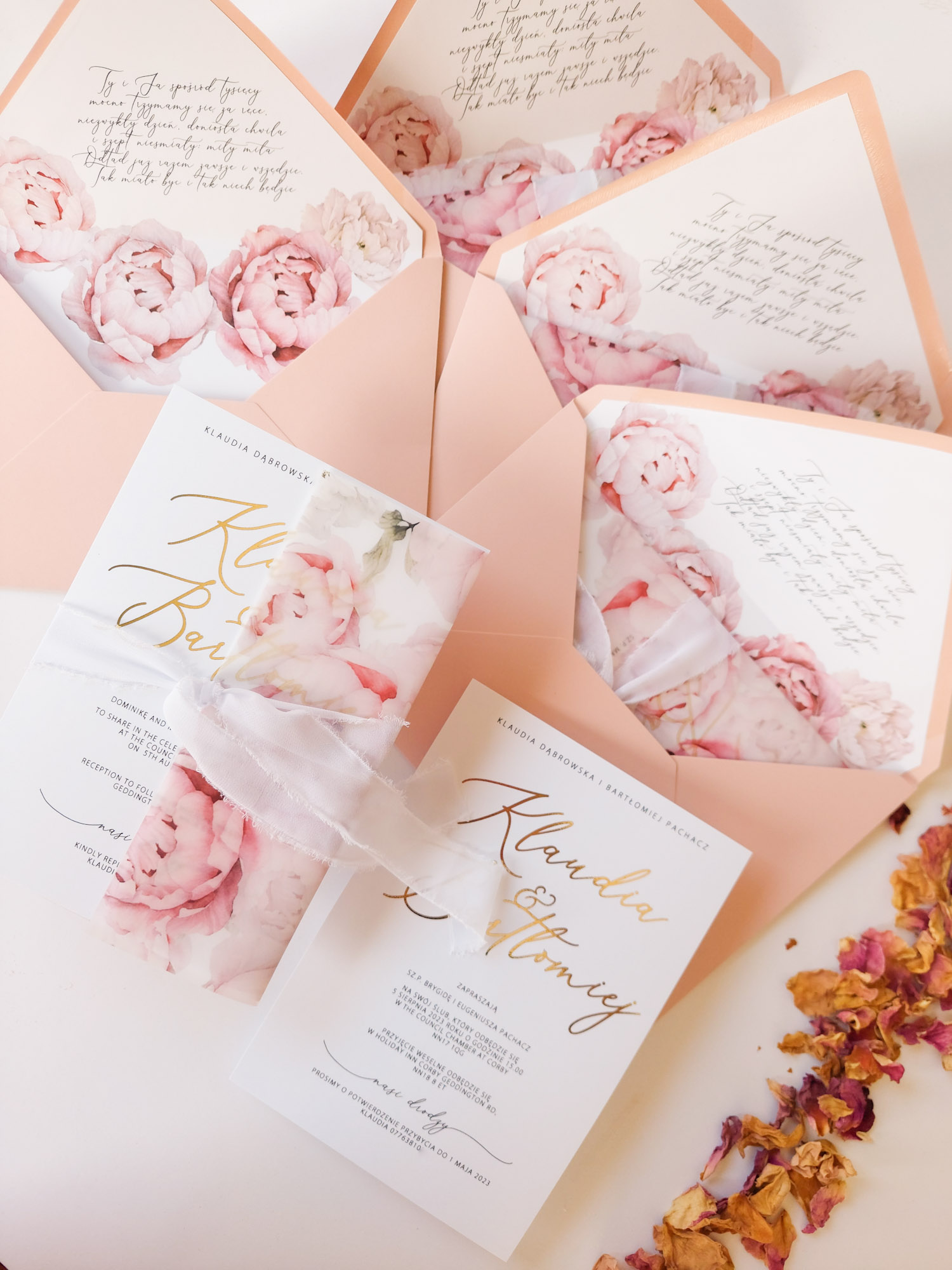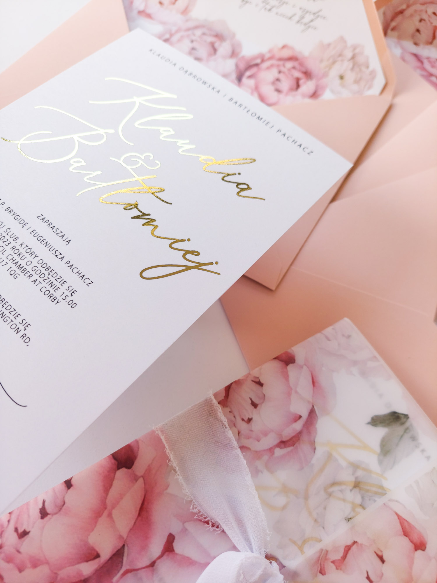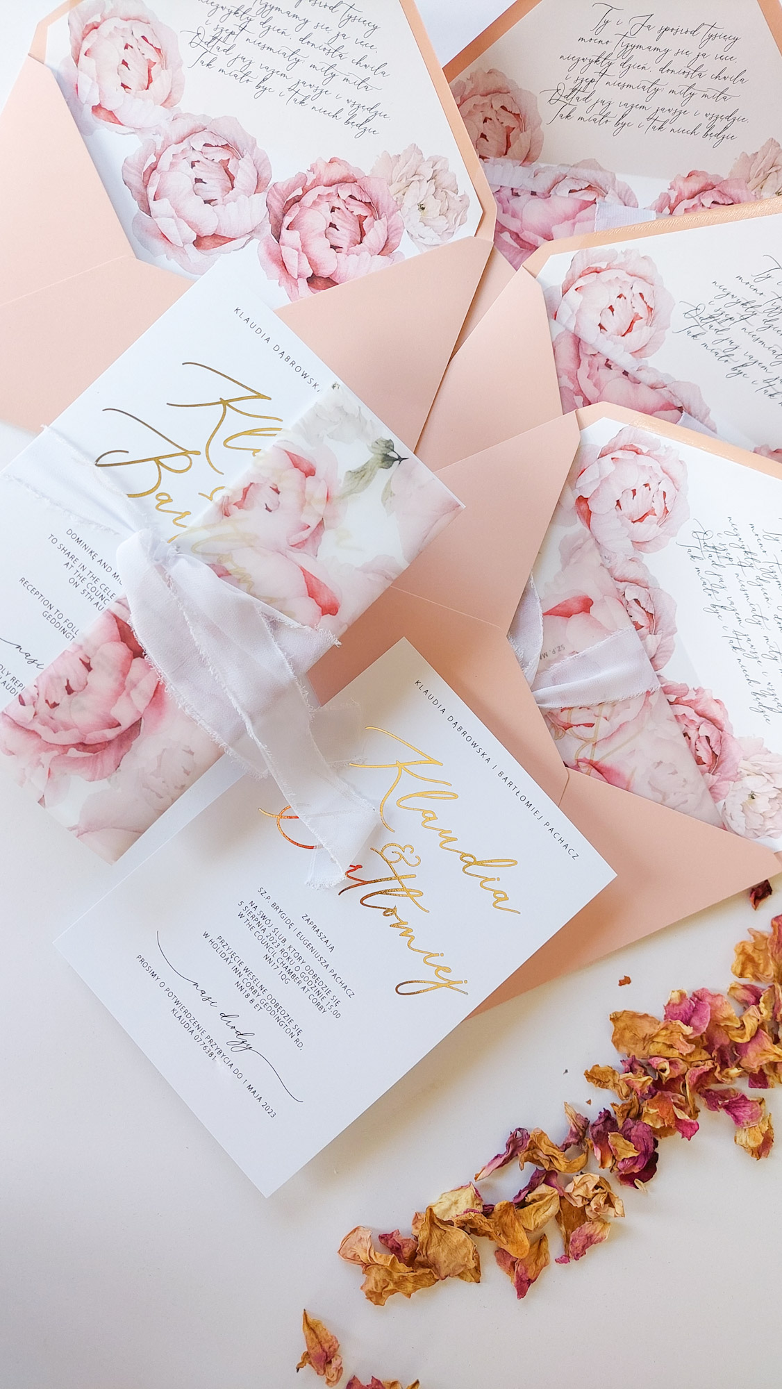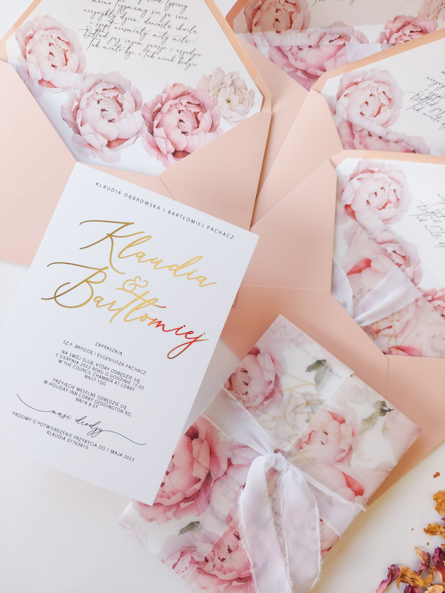 Zaproszenie składa się z jednej karty (rozmiar A5 – jak zeszyt), obwoluty z kalki, szyfonowej wstążki oraz koperty z wklejką. Karta główna o wymiarach 14×21 cm wydrukowana jest jednostronnie, na wysokiej jakości papierze o gramaturze 350 gram. Obwoluta wykonana jest z kalki z nadrukiem piwonii oraz przewiązana szyfonową wstążką. Tekst na karcie można dowolnie modyfikować. Imiona młodych na zaproszeniu uszlachetnione są folią metaliczną. Zaproszenie zamknięte jest w kopercie z dodatkową wkładką z nadrukiem pasującym do grafiki karty głównej.