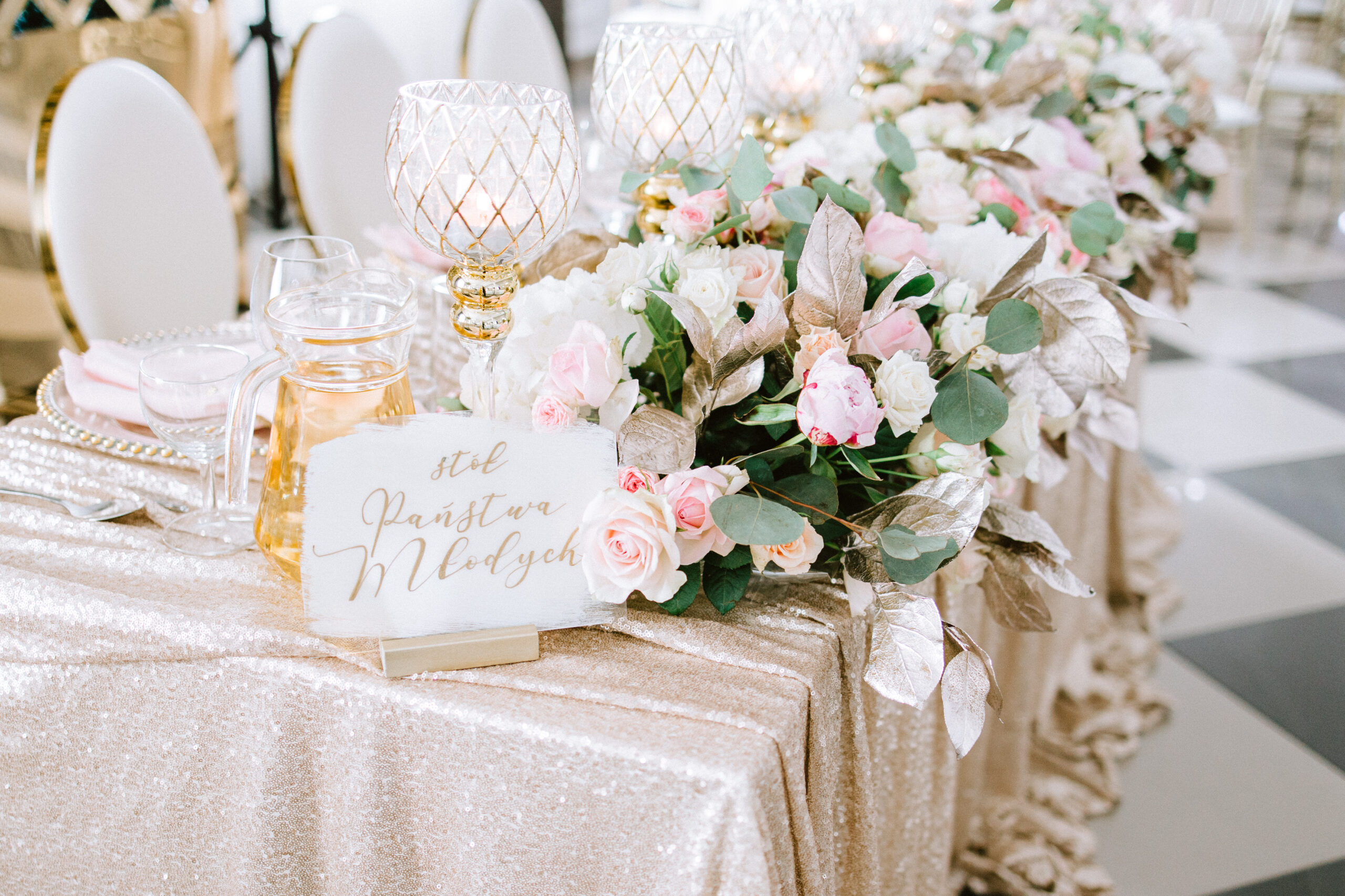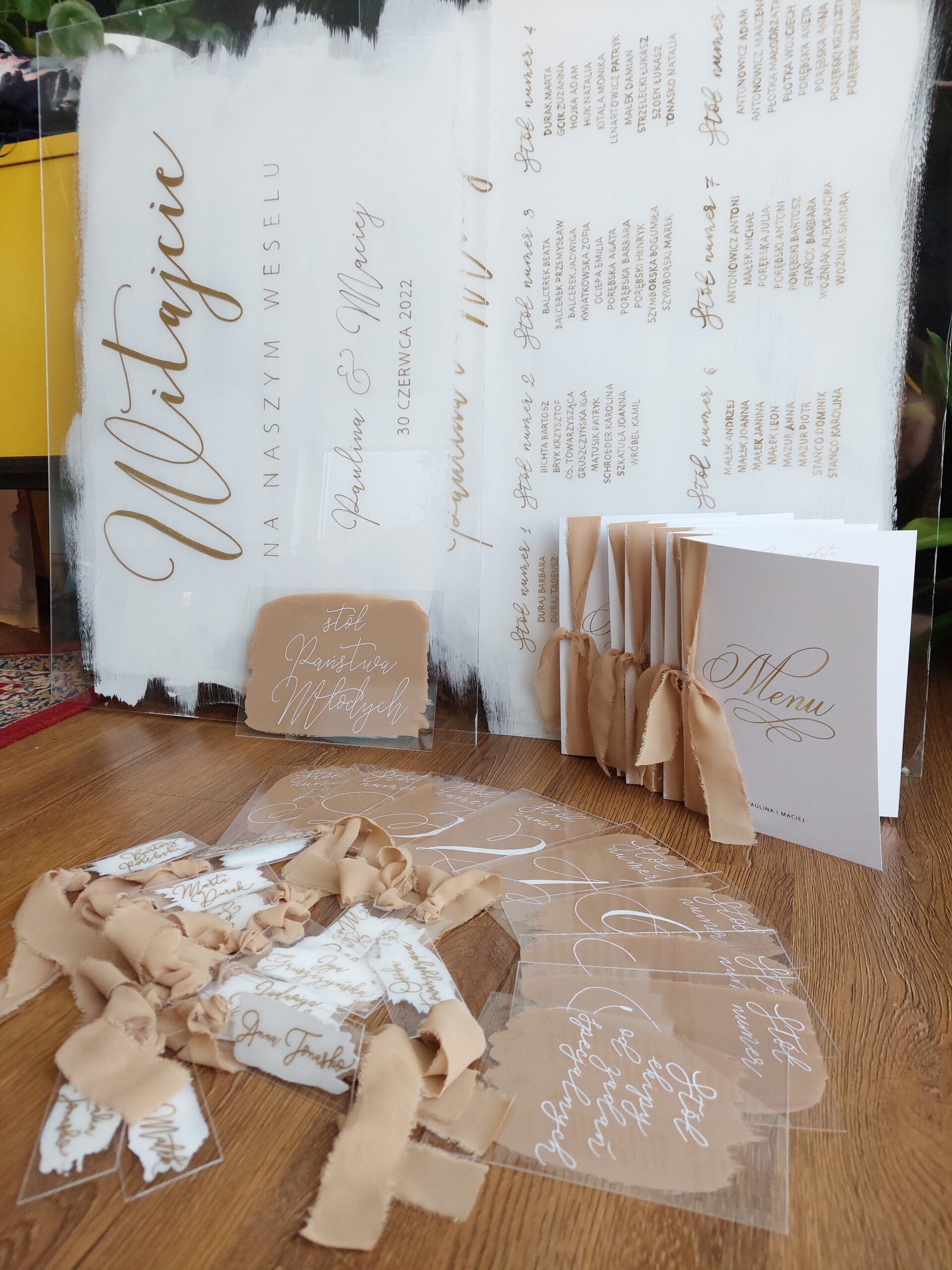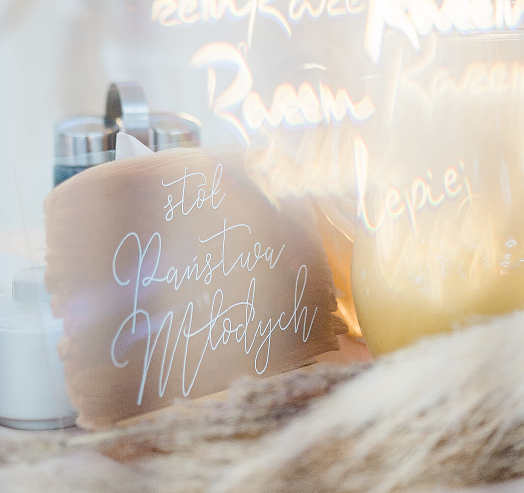 Tabliczka może mieć dowolny krótki napis np. Stół Państwa Młodych, Candy Bar, stół dzieci, słodki stół, stół ekipy od zadań specjalnych i td.