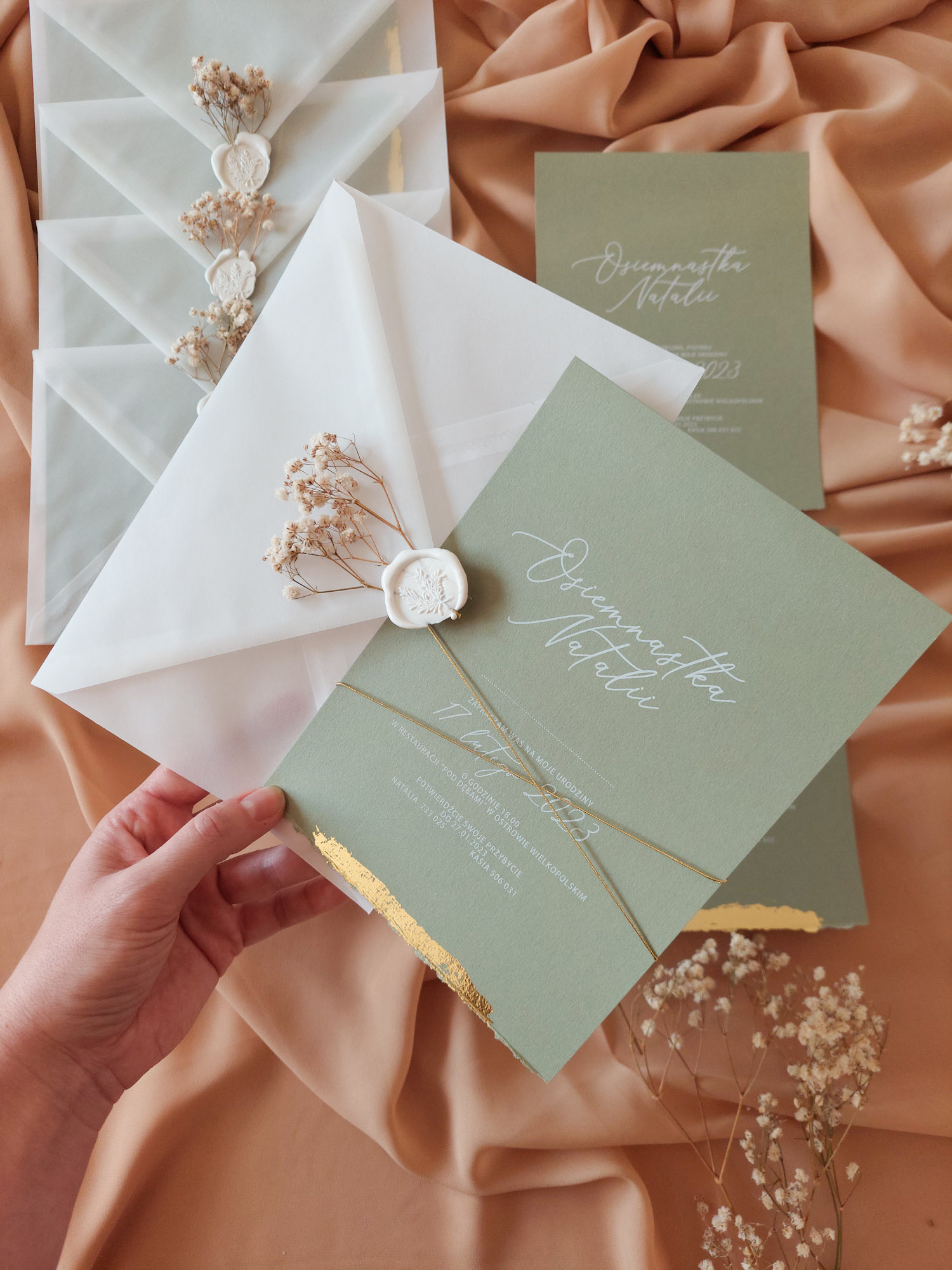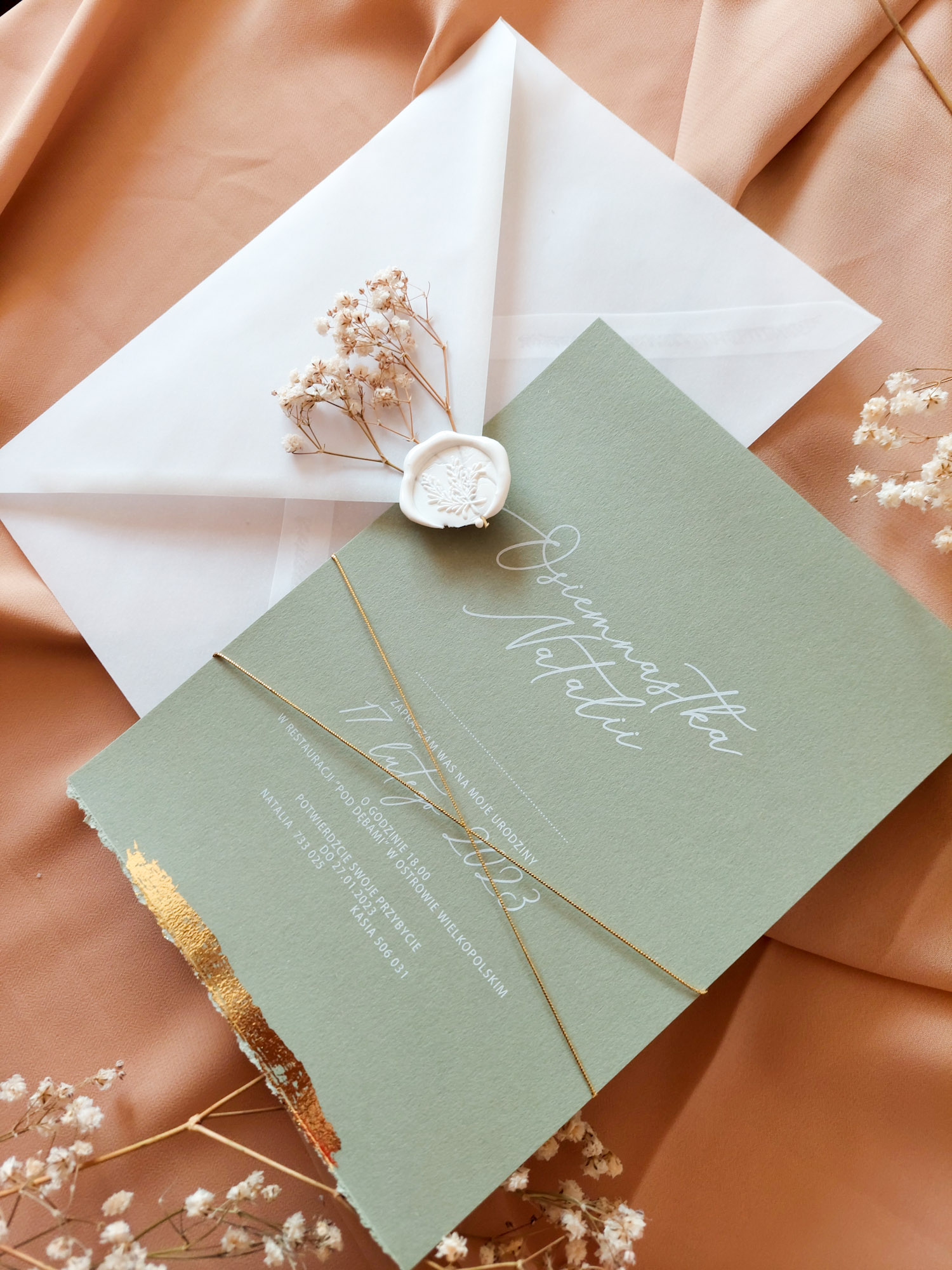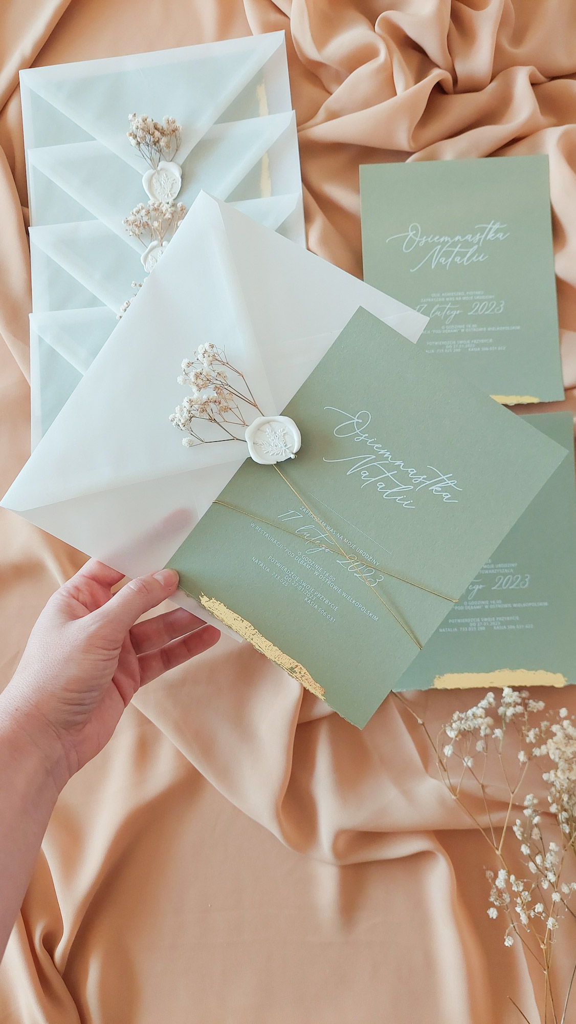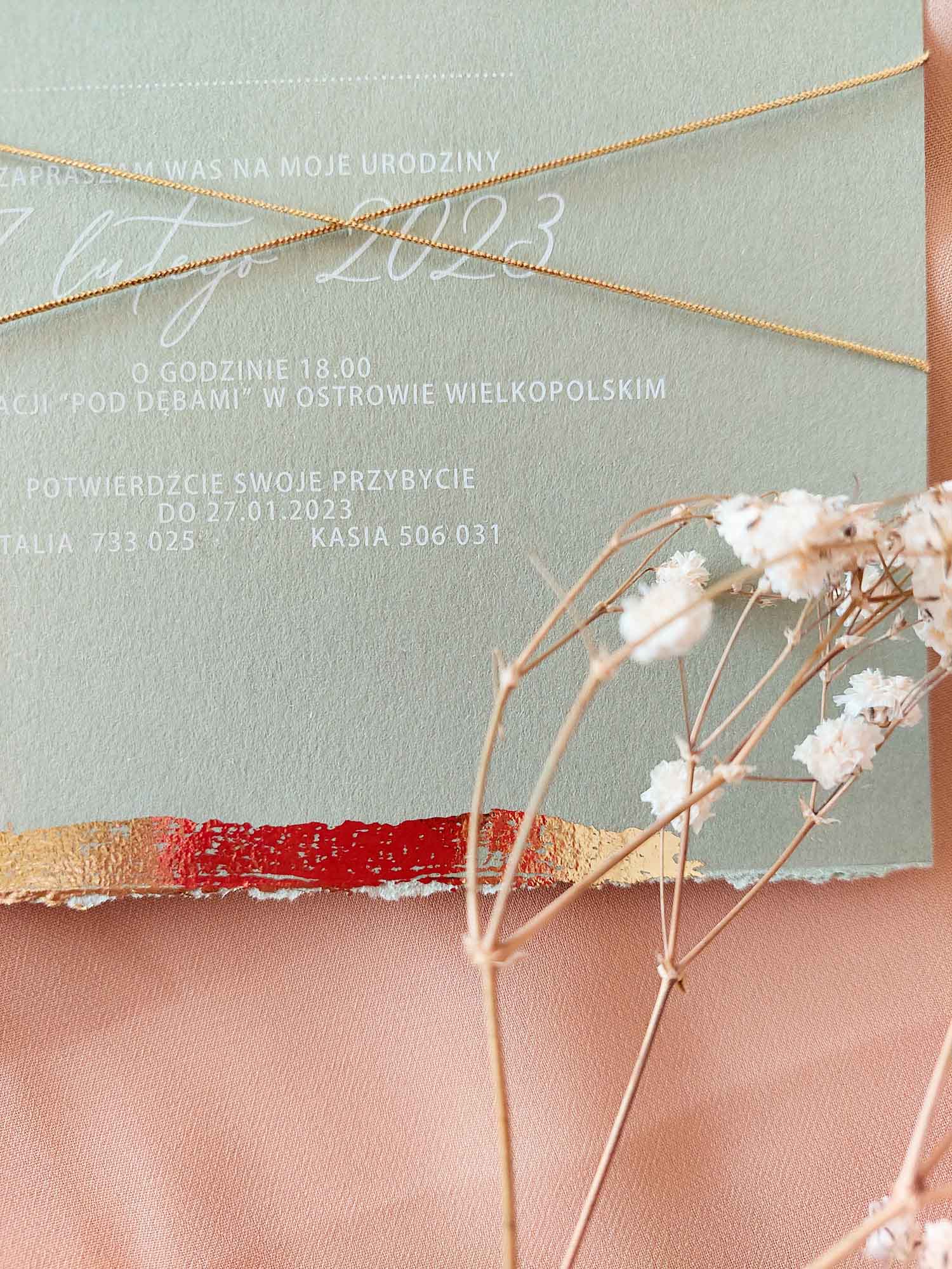 Zaproszenie składa się z jednej karty (duża w formacie A5 – jak zeszyt) o wymiarach 14×21 cm. Zaproszenie wydrukowane jest jednostronnie na wysokiej jakości papierze naturalnym o gramaturze 300 gram technologia białego druku. Kolor karty można zmienić. Tekst na karcie można dowolnie modyfikować i zmienić je w zaproszenie na ślub czy inną okazję. Dolny brzeg jest rwany z dodatkowym uszlachetnieniem metalicznej smugi (może być ona złota lub srebrna). Karta zaproszenia przewiązana jest ozdobnym sznureczkiem (jego kolor można zmienić). Zaproszenie zamknięte jest w kopercie półprzeźroczystej z bukiecikiem suszonej gipsówki i lakiem. Lak woskowy wykonujemy w tej sposób aby zaproszenie można było otwierać bez uszkodzenia (jest on przymocowany wyłącznie do górnej klapy zaproszenia).