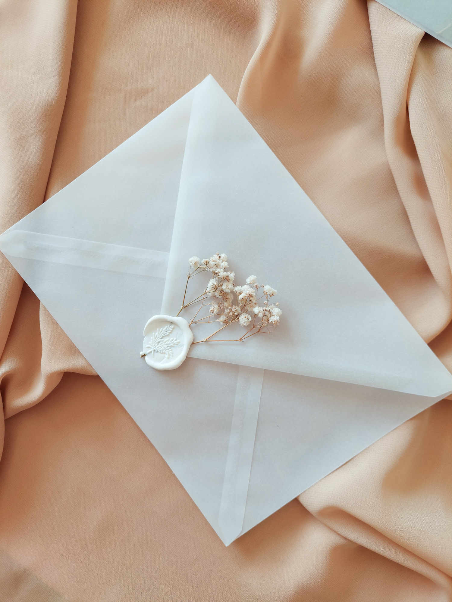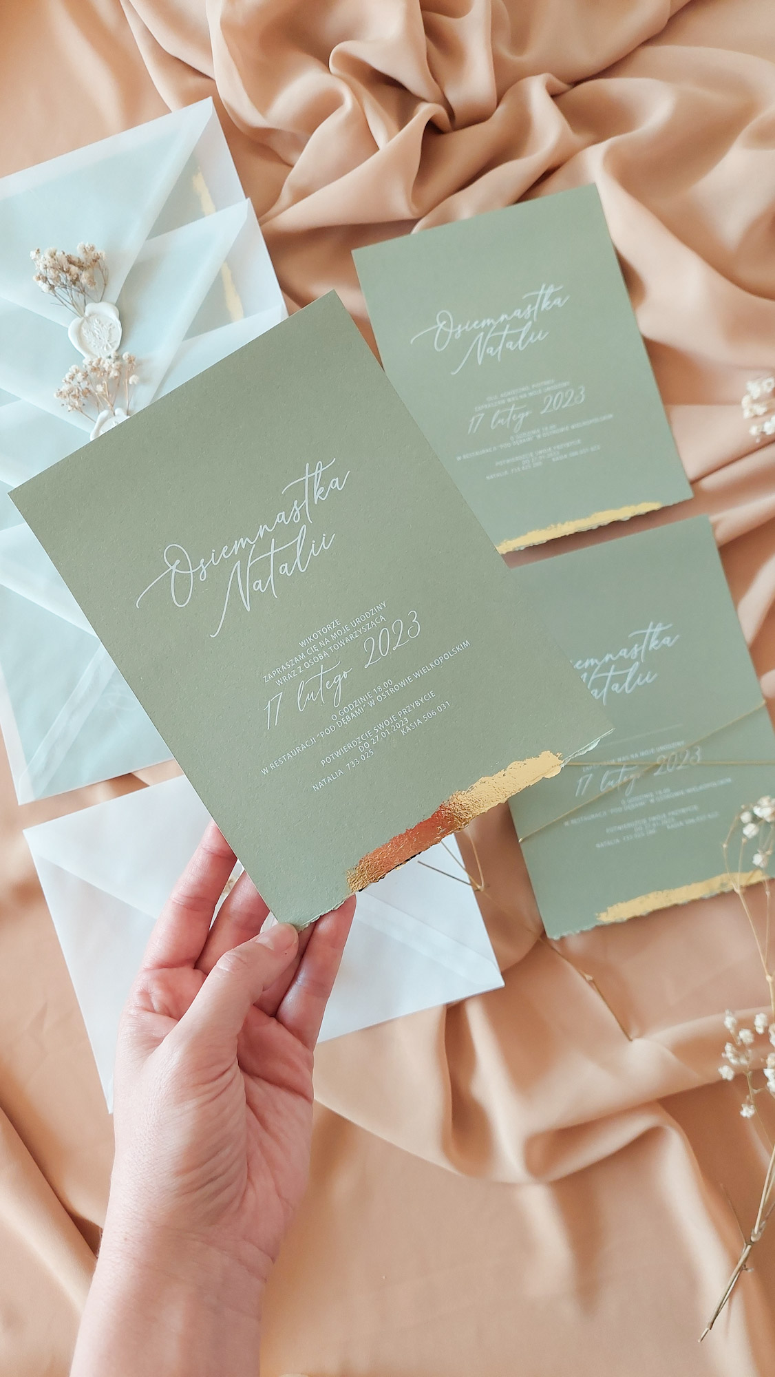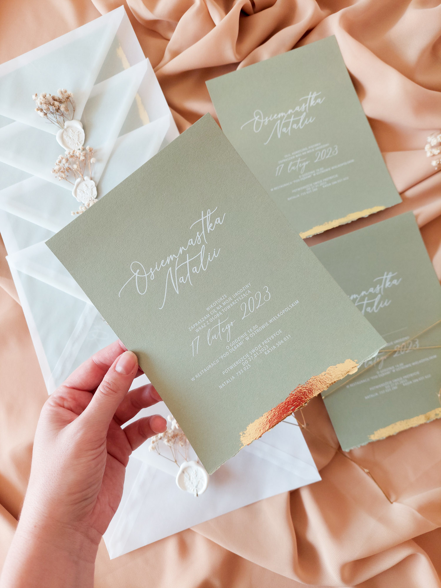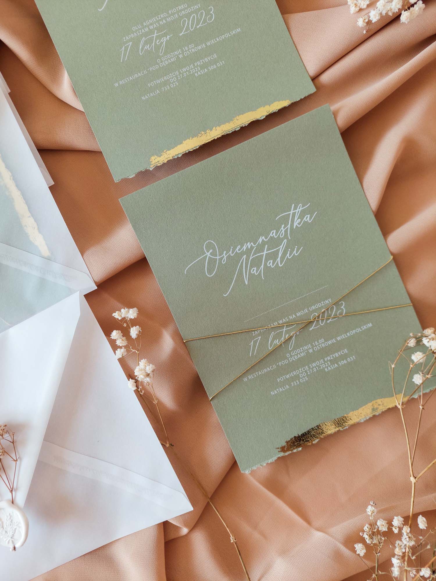 Zaproszenie składa się z jednej karty (duża w formacie A5 – jak zeszyt) o wymiarach 14×21 cm. Zaproszenie wydrukowane jest jednostronnie na wysokiej jakości papierze naturalnym o gramaturze 300 gram technologia białego druku. Kolor karty można zmienić. Tekst na karcie można dowolnie modyfikować i zmienić je w zaproszenie na ślub czy inną okazję. Dolny brzeg jest rwany z dodatkowym uszlachetnieniem metalicznej smugi (może być ona złota lub srebrna). Karta zaproszenia przewiązana jest ozdobnym sznureczkiem (jego kolor można zmienić). Zaproszenie zamknięte jest w kopercie półprzeźroczystej z bukiecikiem suszonej gipsówki i lakiem. Lak woskowy wykonujemy w tej sposób aby zaproszenie można było otwierać bez uszkodzenia (jest on przymocowany wyłącznie do górnej klapy zaproszenia).