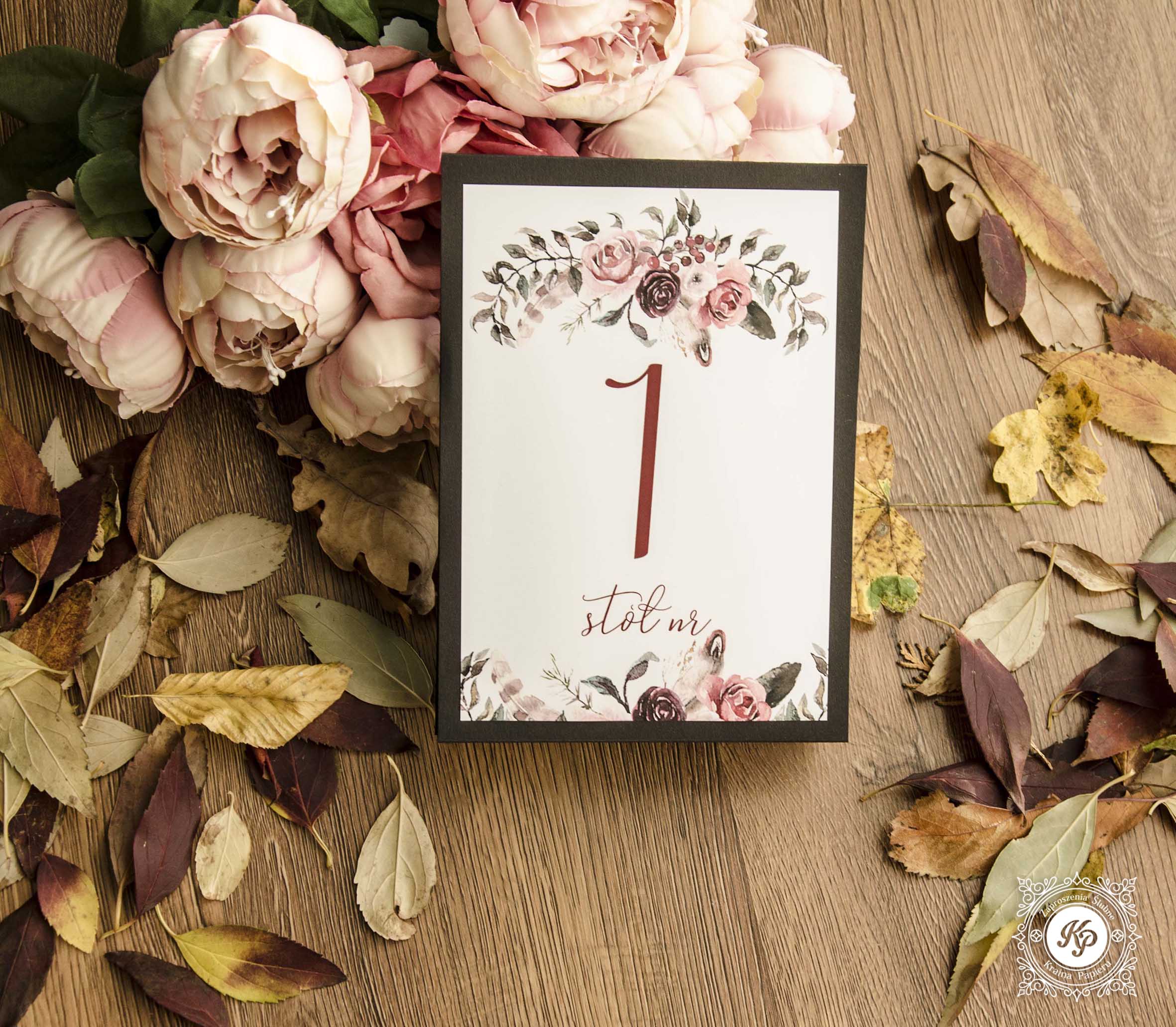 Numer stołu papierowe, drukowane w formacie ok 14×21 cm (może mieć również inny format). Numery te są samodzielnie stojące, nie wymagają podpórek. Drukowane są dwustronnie, mogą zawierać elementy metaliczne. Dopasujemy je do każdego zaproszenia i stylu wesela.