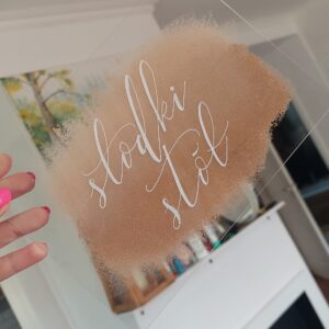 Tablica w formacie 30×40. Wykonana z pleksi o grubości 3mm, sztywna, idealna do stawiania na sztalugach. Kolor tła może być dowolny, kolor napisów: złoty, srebrny, biały, czarny, miedziany.