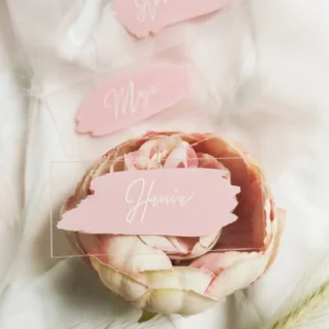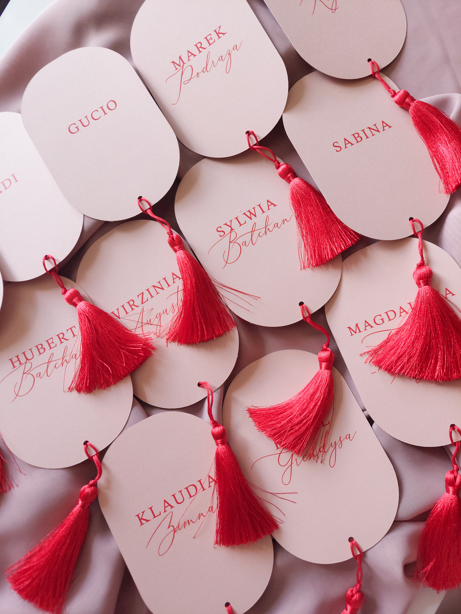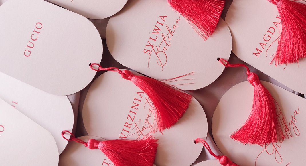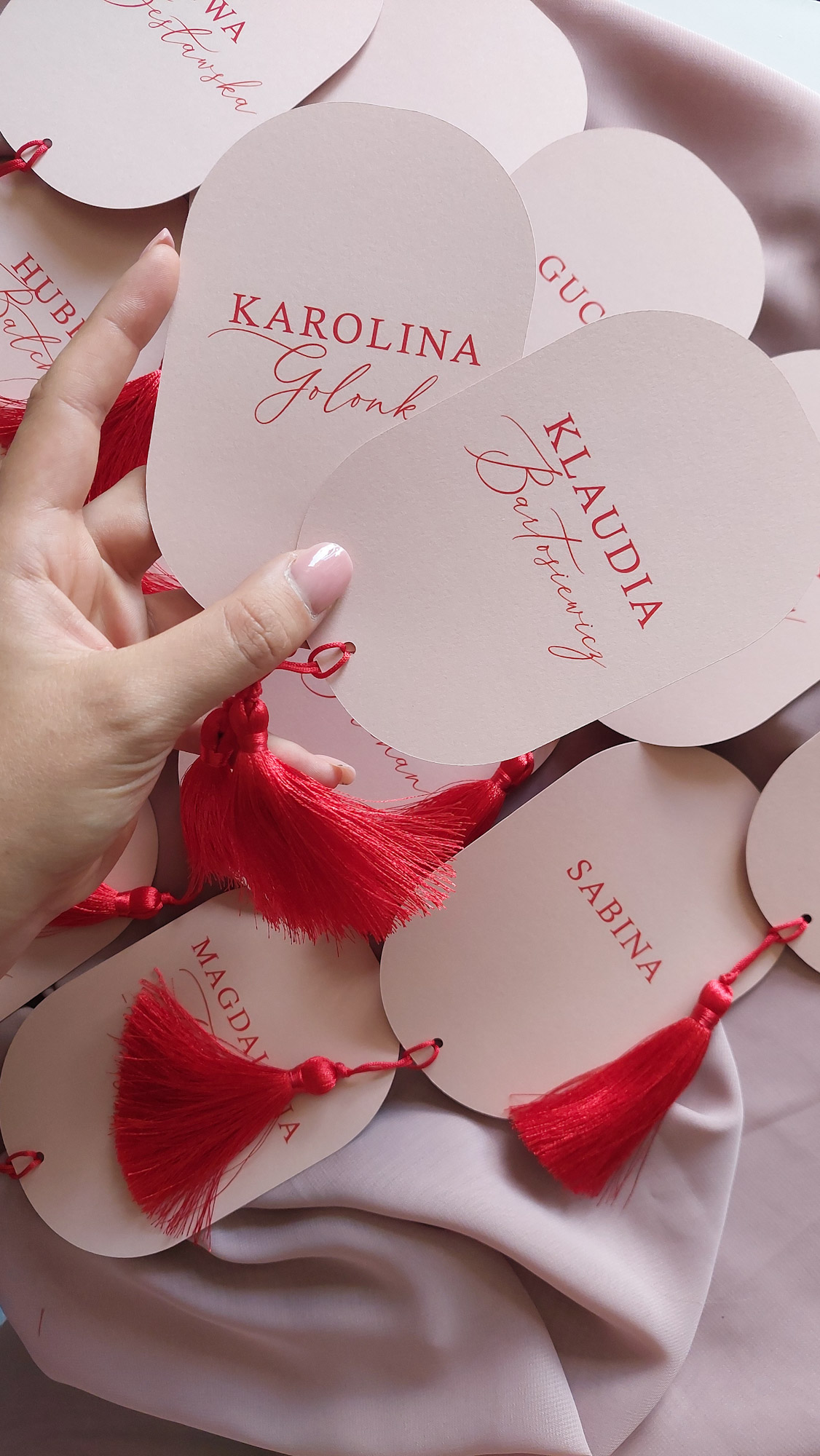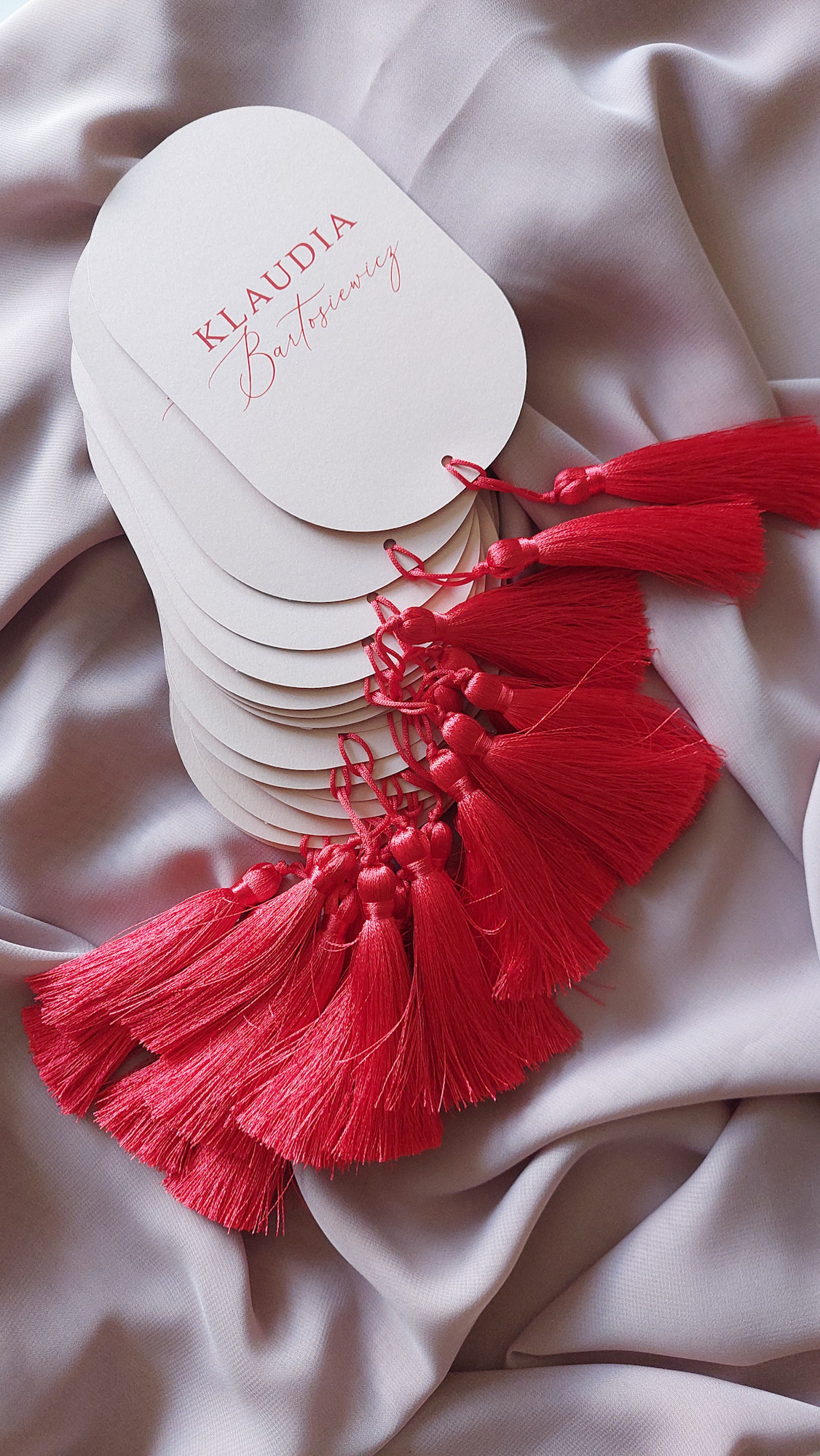 Winietka w rozmiarze ok 10×14 cm z zaokrągleniem. Winietka drukowana na papierze barwionym w masie. Kolor papieru może być dowolny. Winietka ozdobiona jest chwostem (można go zamienić na szyfonową wstążkę).