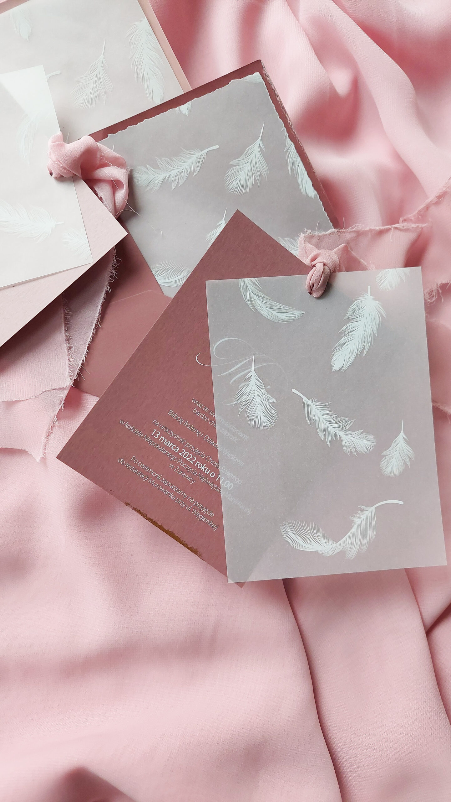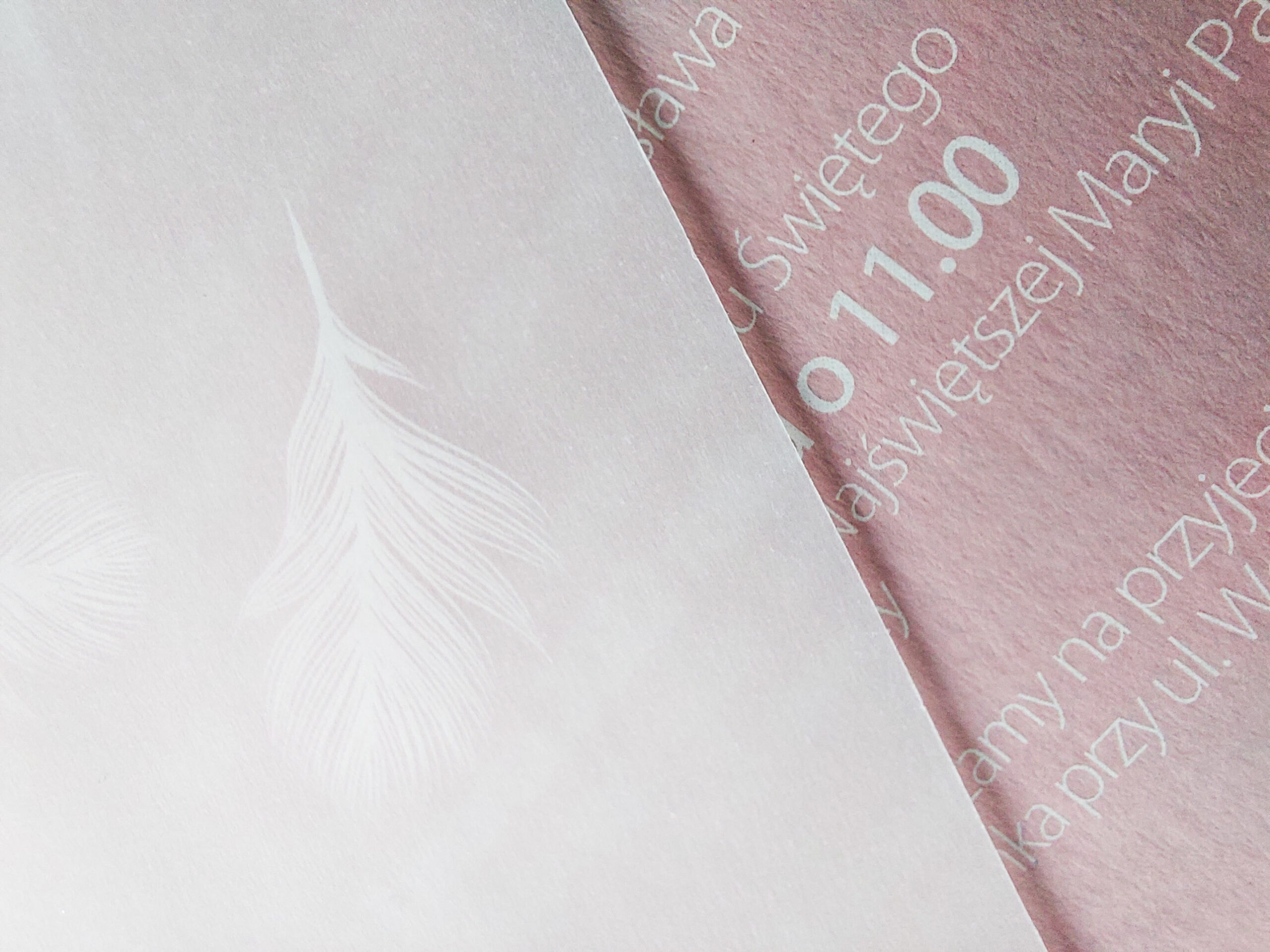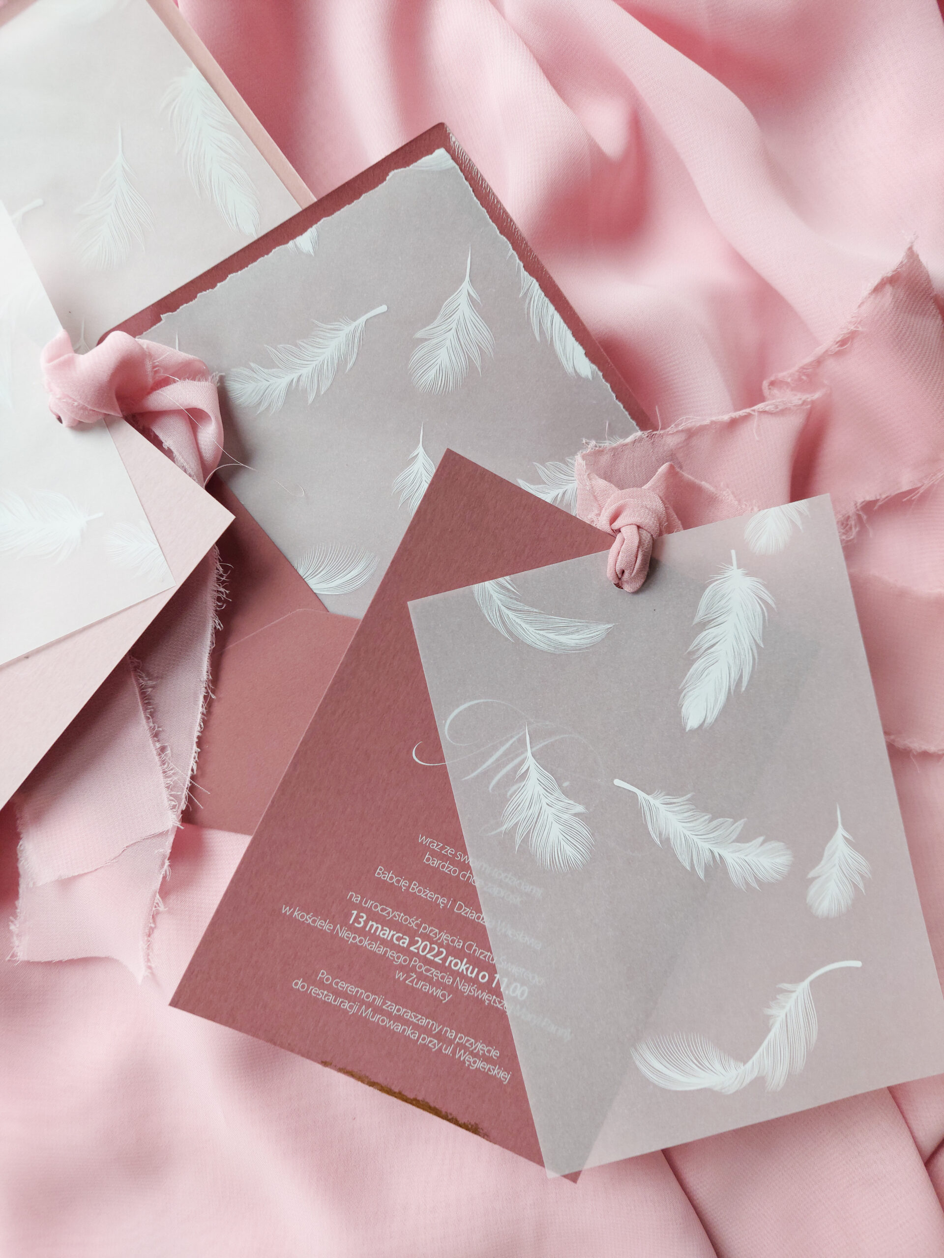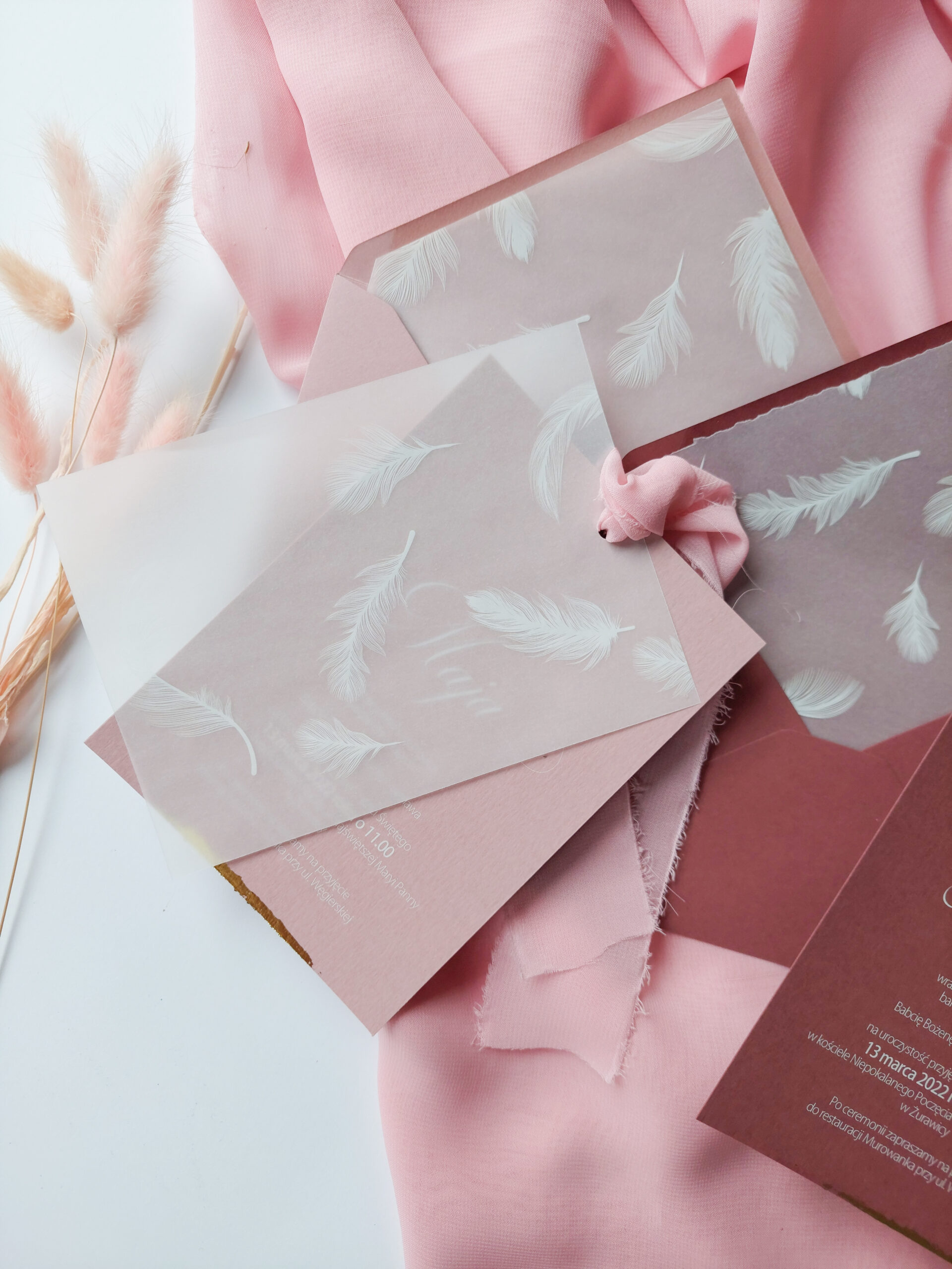 Zaproszenie wkładane jest w kopertę w kolorze takim samym jak baza zaproszenie, z dodatkową wkładką z kalki z białym nadrukiem pióra. Wkładka może mieć proste brzegi lub rwane.