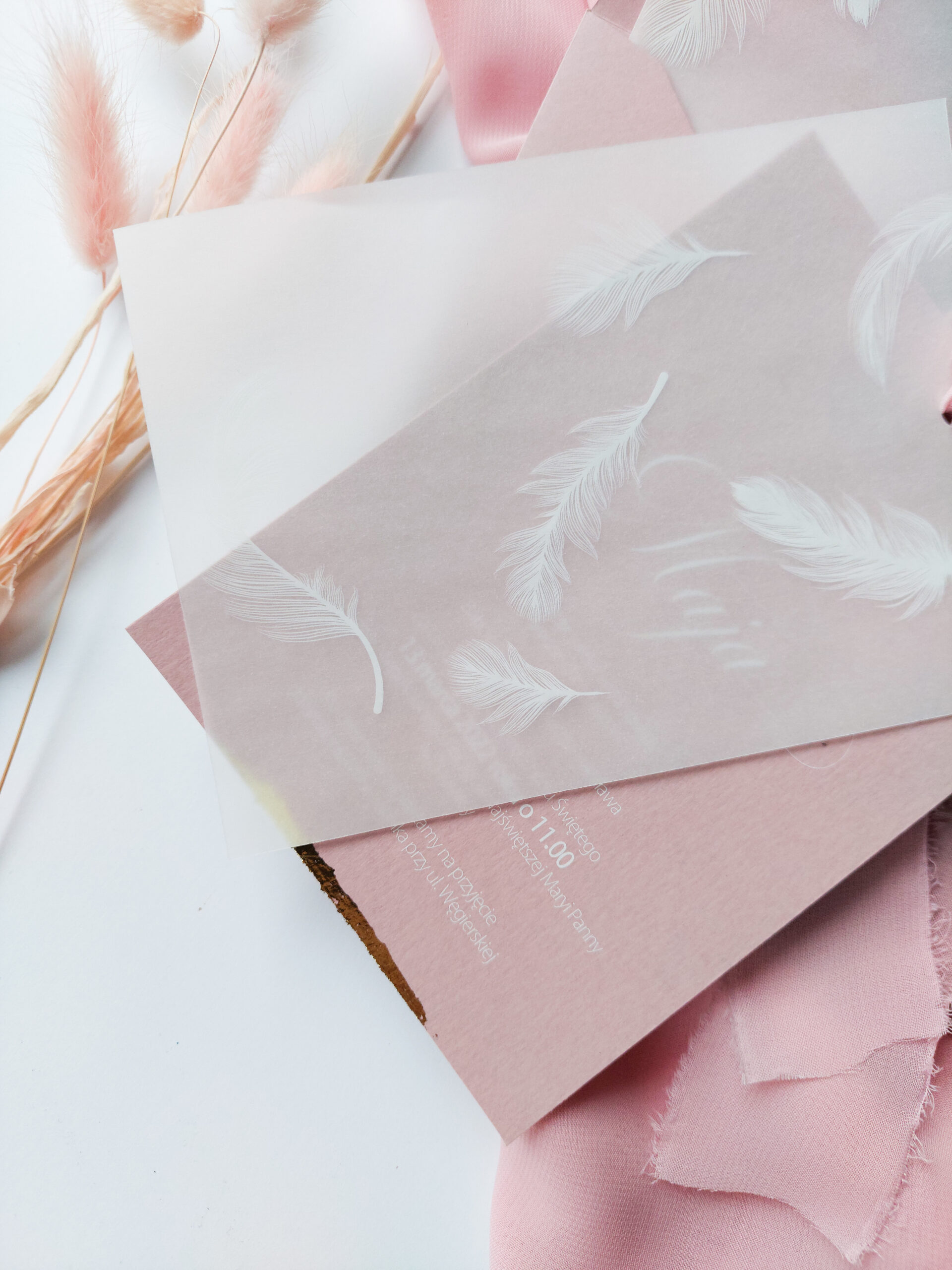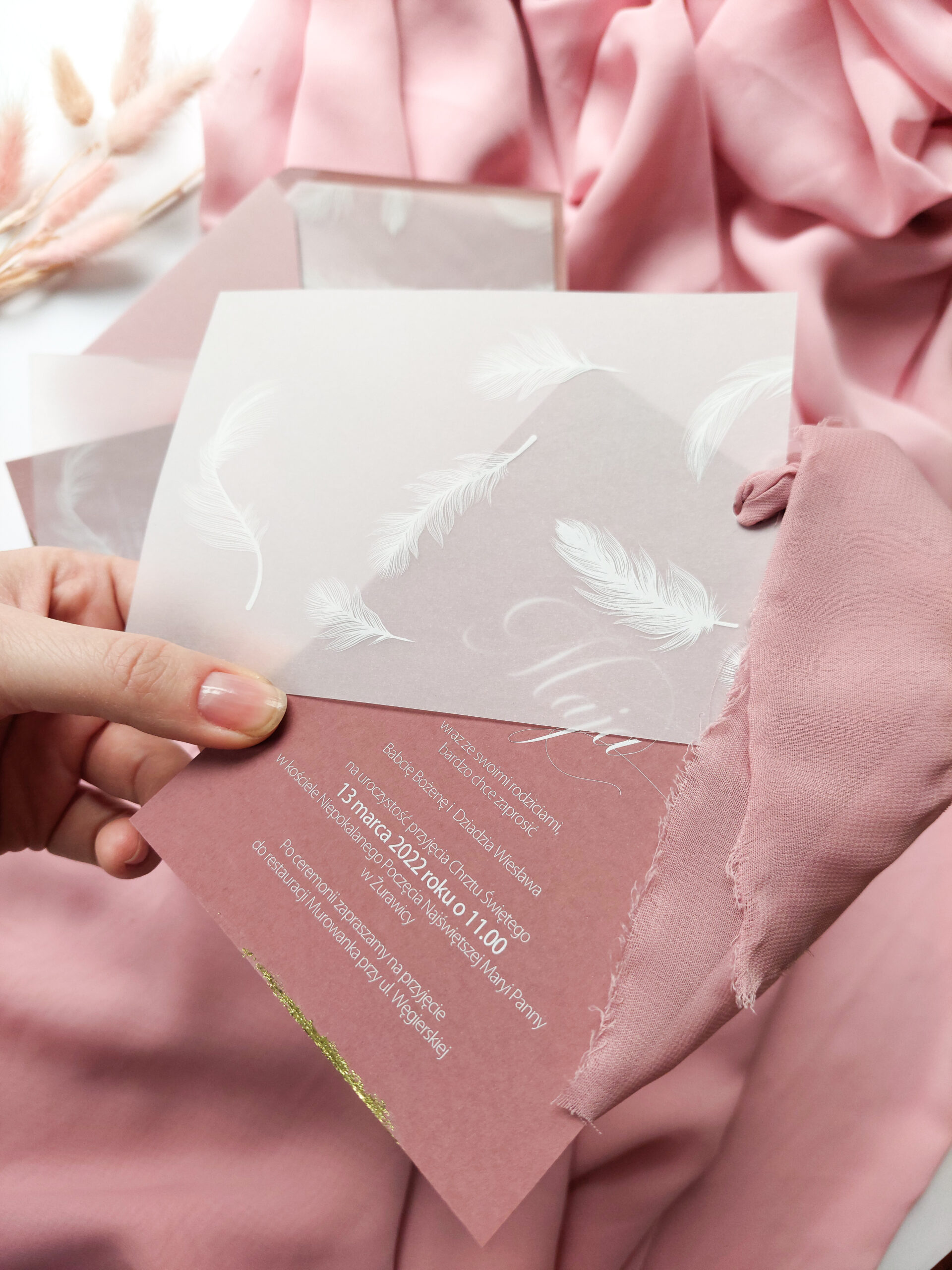 Zaproszenie jednokartowe w formacie 10x14cm. Bazą zaproszenia jest papier barwiony w masie o gramaturze 300g z ozdobną smugą złota u dołu. Karta ozdobna wykonana jest z kalki z białym nadrukiem piór. Całość połączona jest ręcznie rwaną szyfonową wstążką. Tekst zaproszenia można dowolnie zmieniać.
