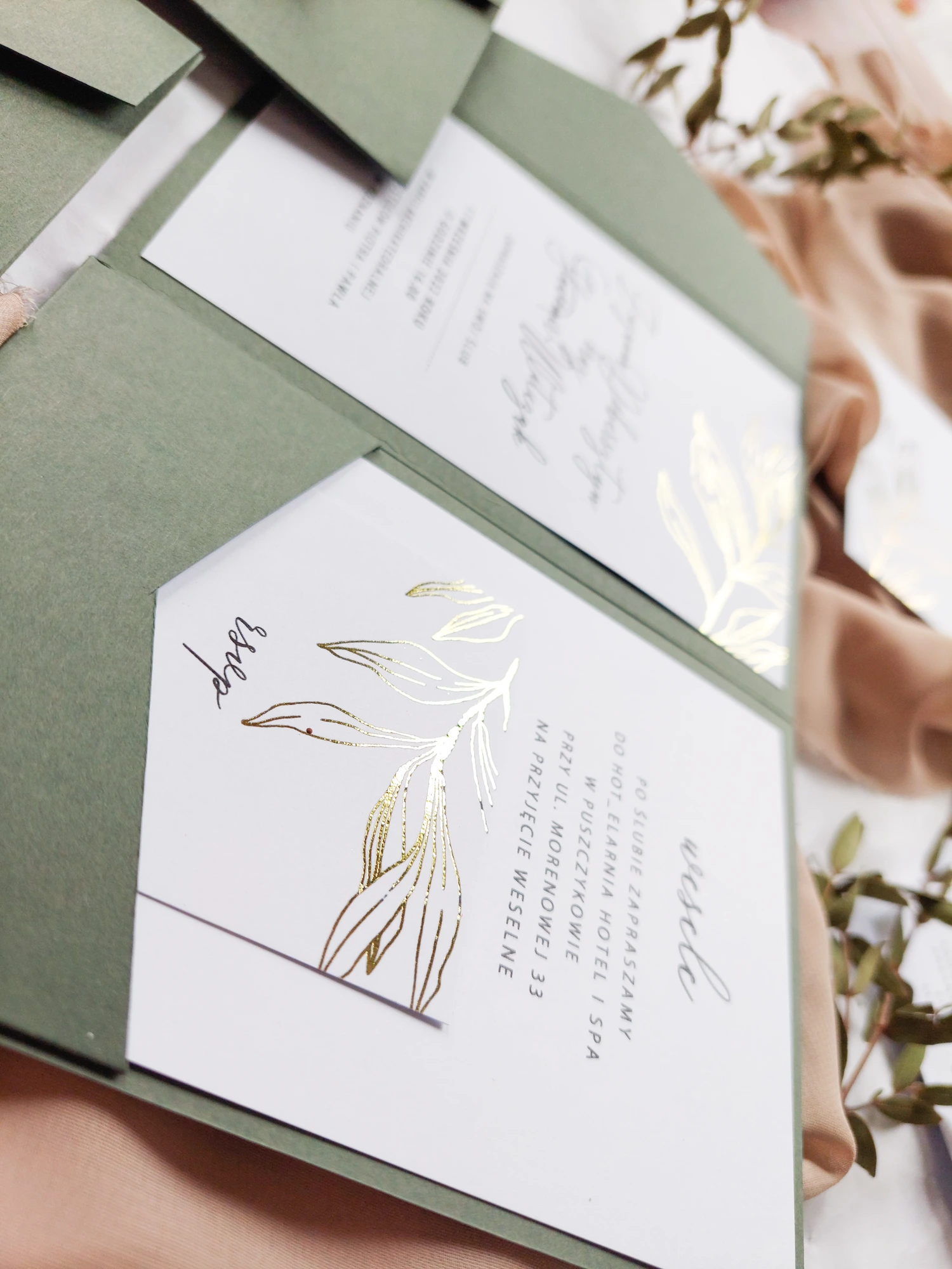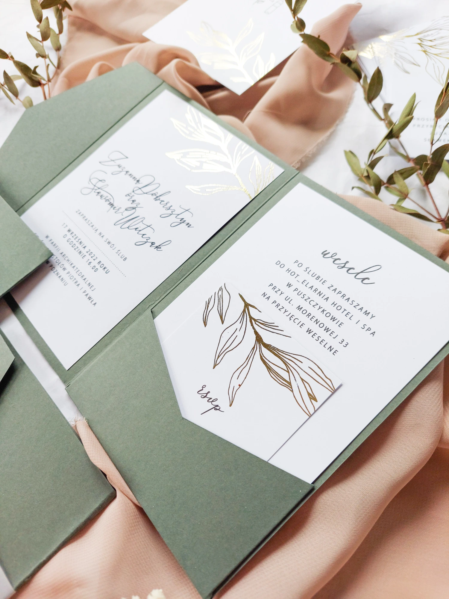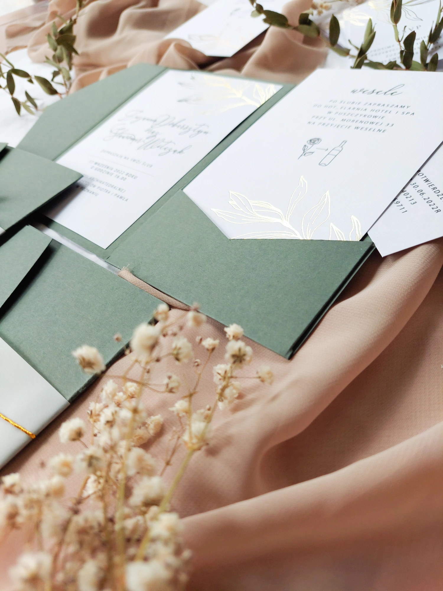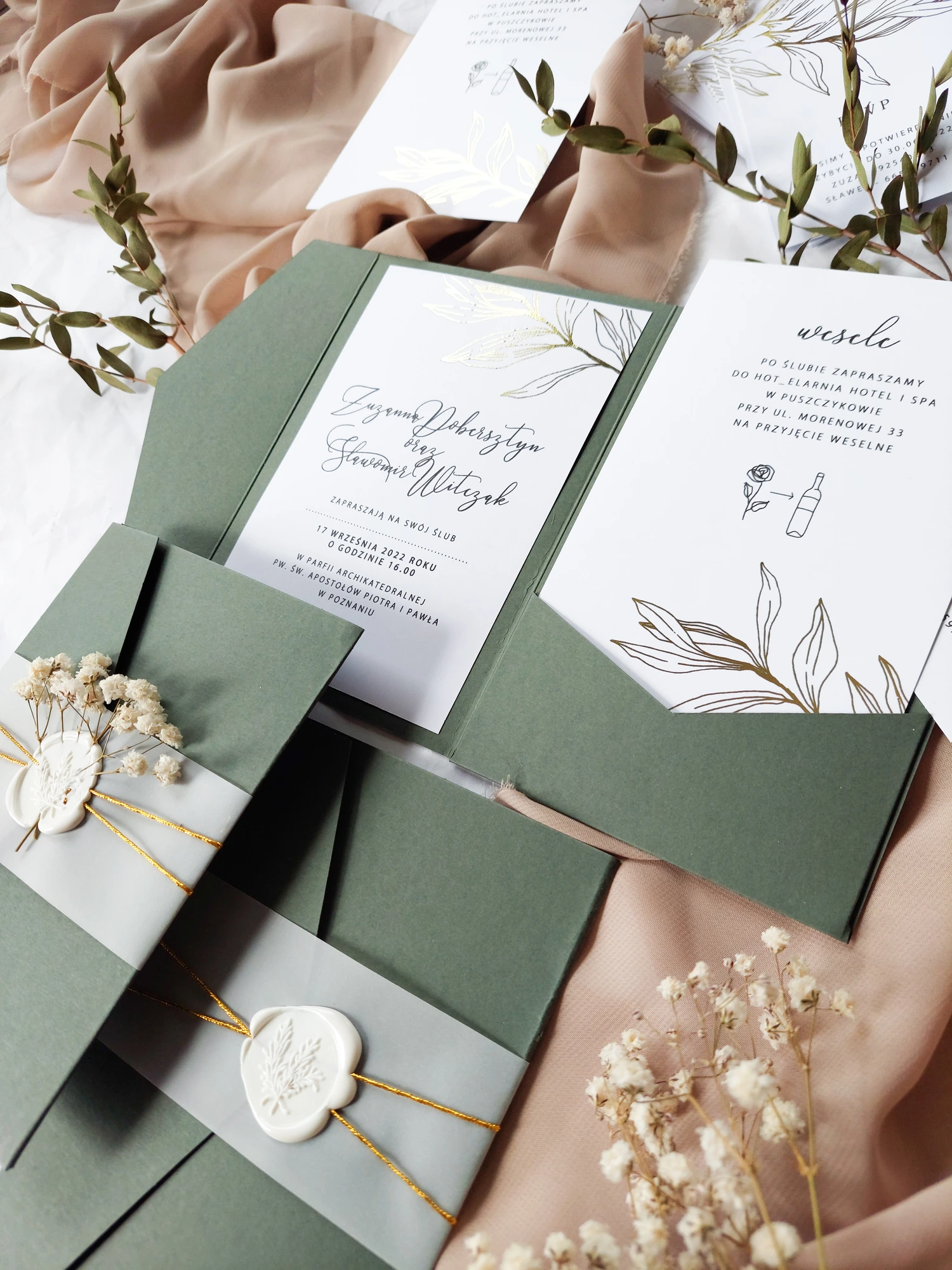 Zaproszenie w formie folderu z kieszonką. Zaproszenie składa się z folderu z kieszonką, trzech kart, opaski, złotego sznurka oraz laku. Karta główna o wymiarach 10×14 cm jest wklejona na stałe do zaproszenia. Pozostałe karty są wsadzone do kieszonki. Karta większa w kieszonce ma rozmiar 10×14 cm, a mniejsza 8x9cm.